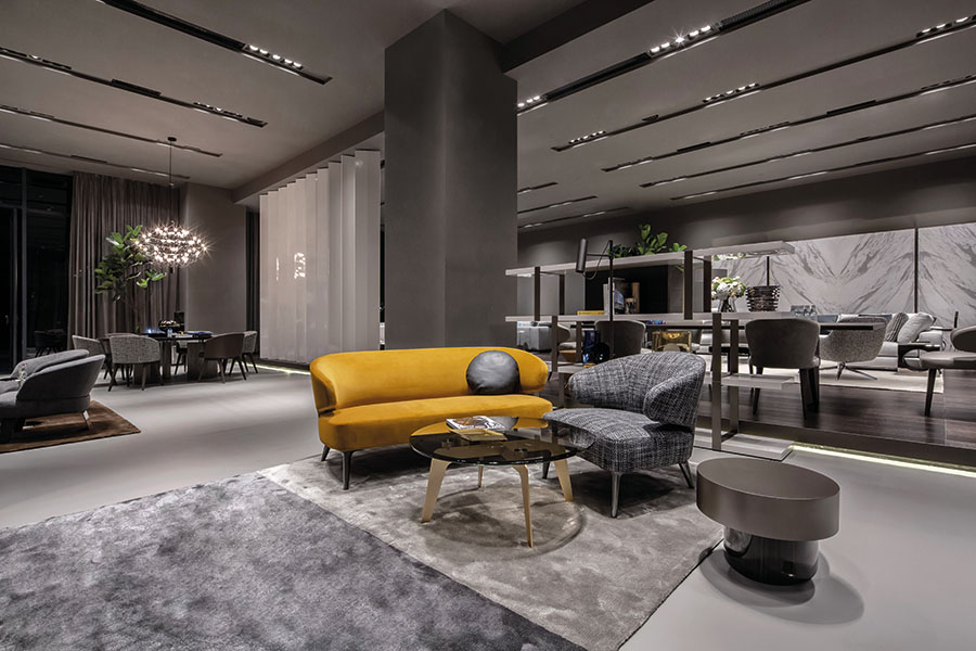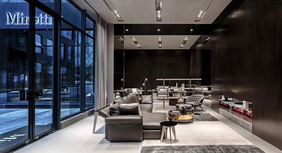 展厅拥有迷人的建筑设计和一丝不苟的细节,通过融合不同造型、色彩和精选材质来向参观者呈现品牌与众不同的形象。精致的家居设计方案诠释出优雅的都市格调,与环境和谐统一,充分演绎Minotti风格。