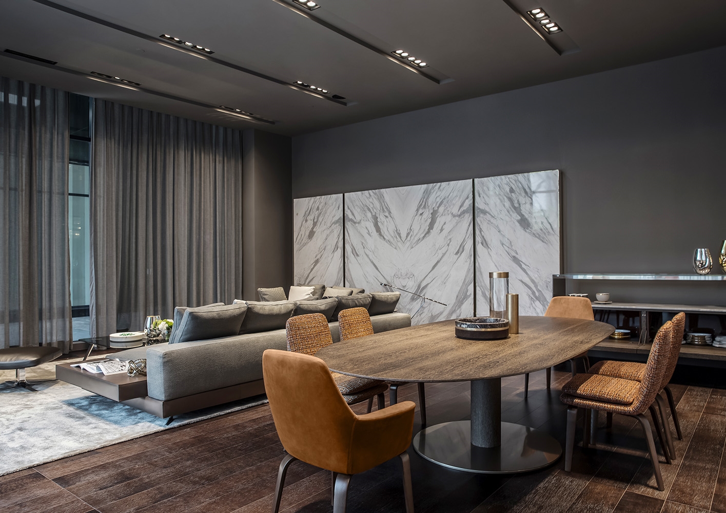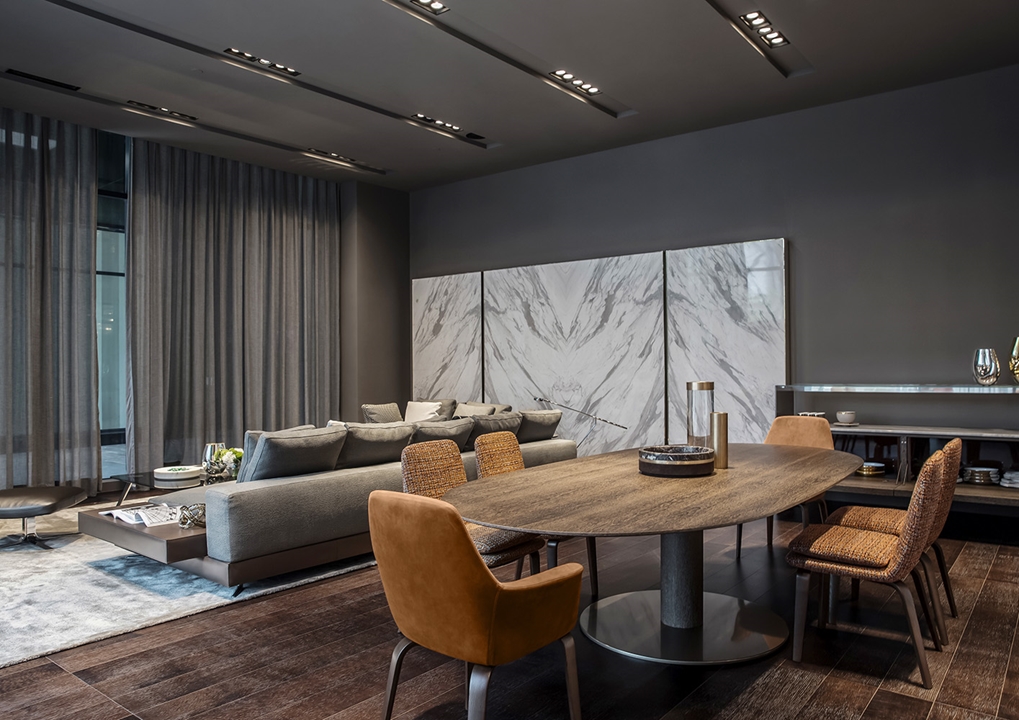 展厅拥有迷人的建筑设计和一丝不苟的细节,通过融合不同造型、色彩和精选材质来向参观者呈现品牌与众不同的形象。精致的家居设计方案诠释出优雅的都市格调,与环境和谐统一,充分演绎Minotti风格。