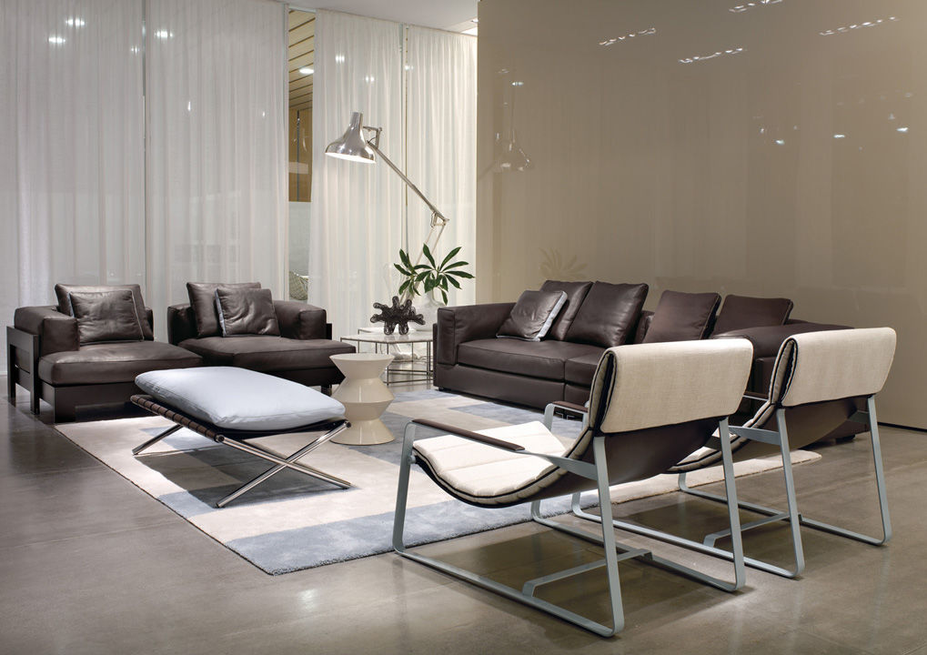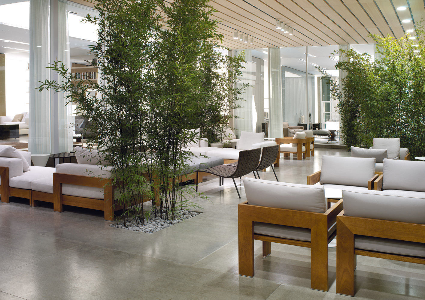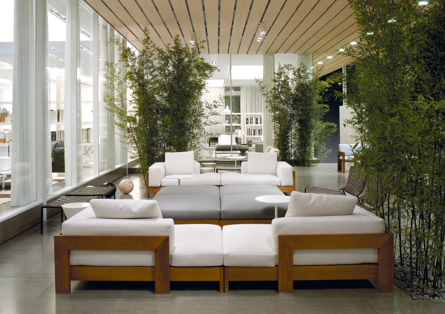 “花园”区内设有众多包括沙发与靠椅在内的座椅组合,室内外皆可使用。室外产品,前所未有的创举。可想而知,室外装潢与室内装潢间的对话是本次设计的真正理念所在。产品系列秉持同一理念,成就室内外家居环境的美学协调