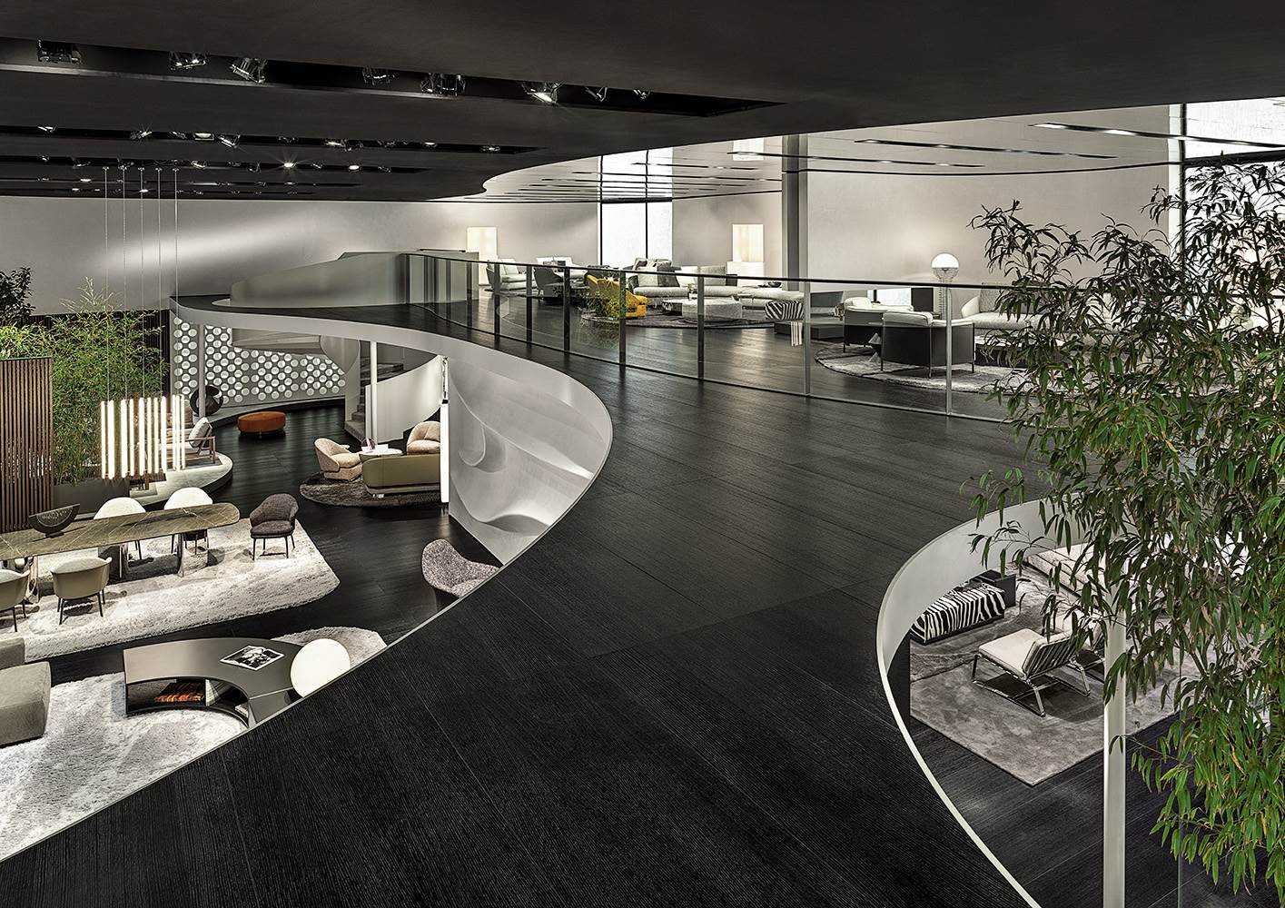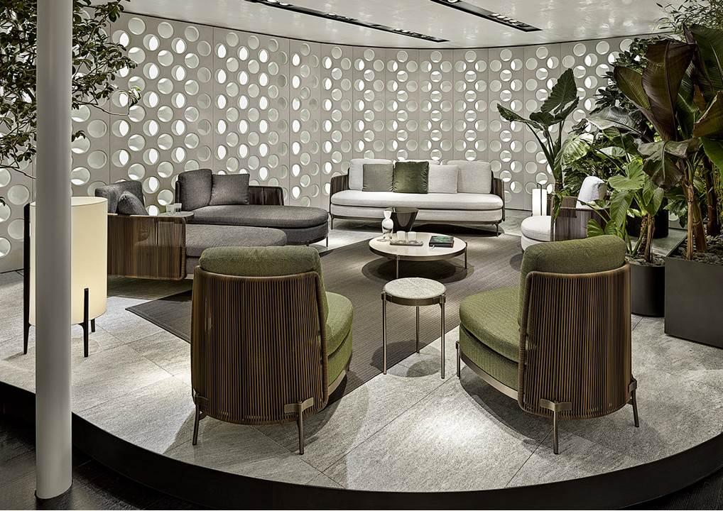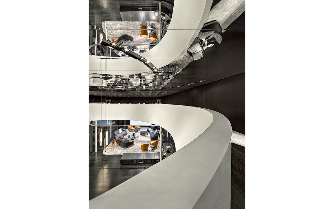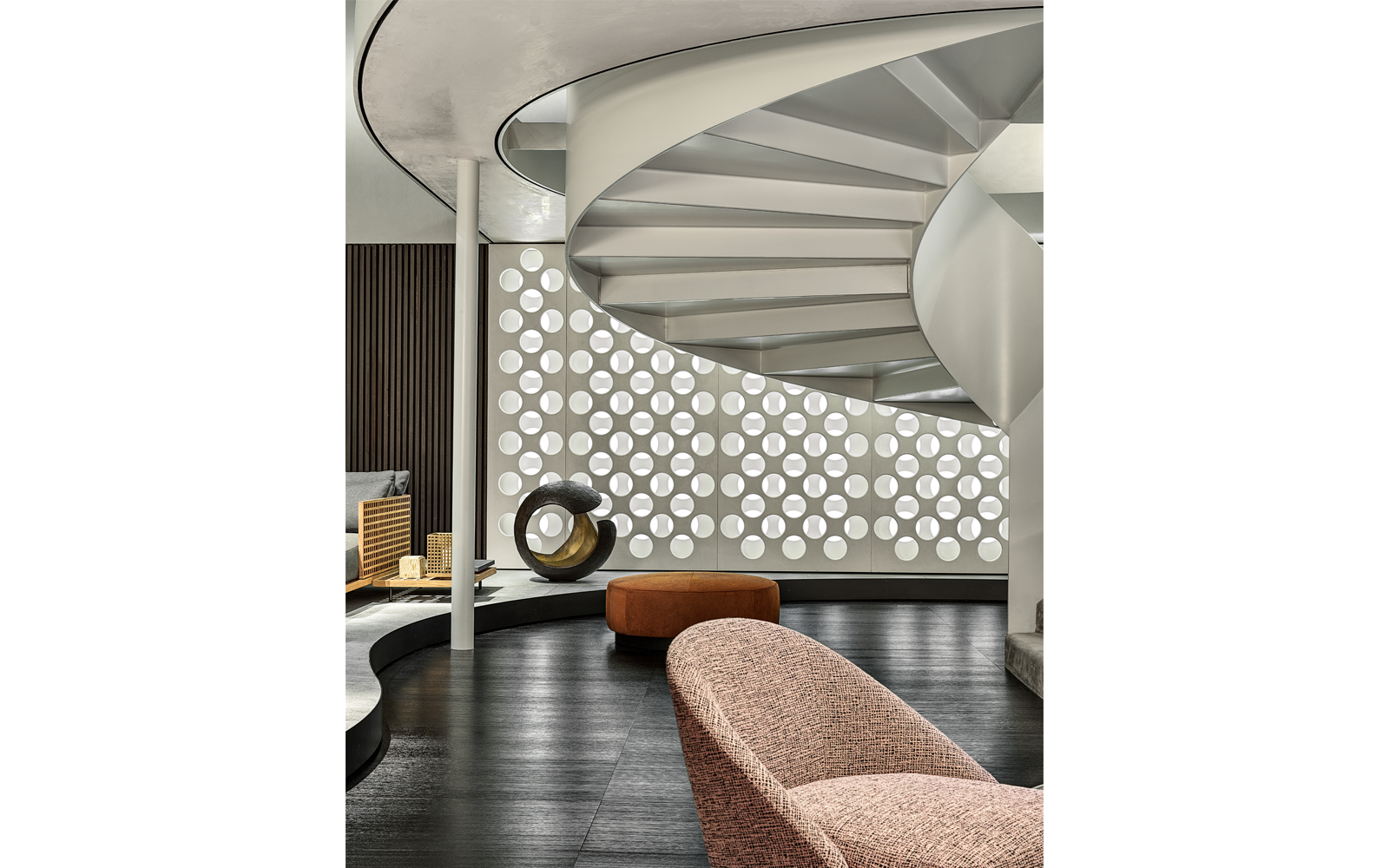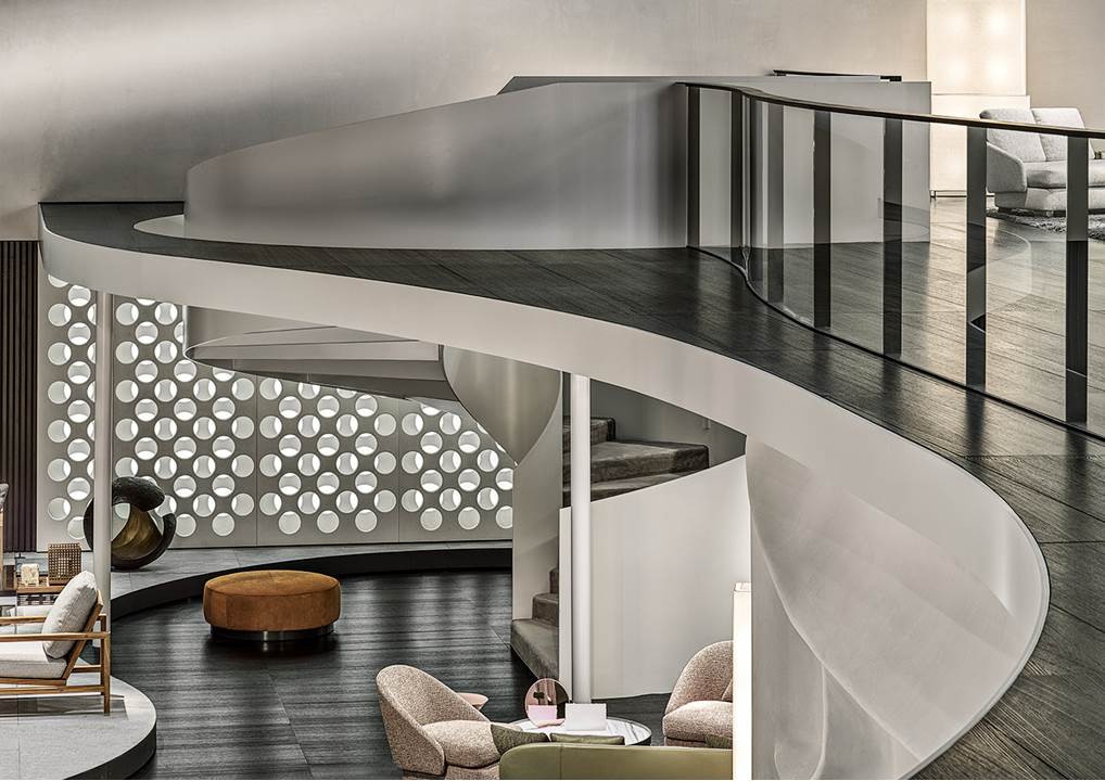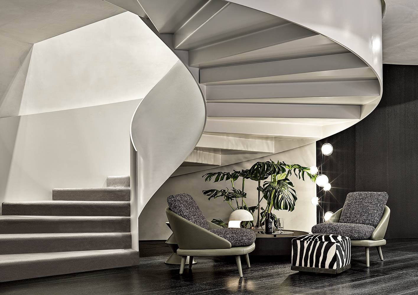 通过两个别致的螺旋楼梯,参观者可以来到上层空间,这里展出Minotti酒店设计项目的全新产品系列,为会话区和休闲区打造出优雅私密的氛围。