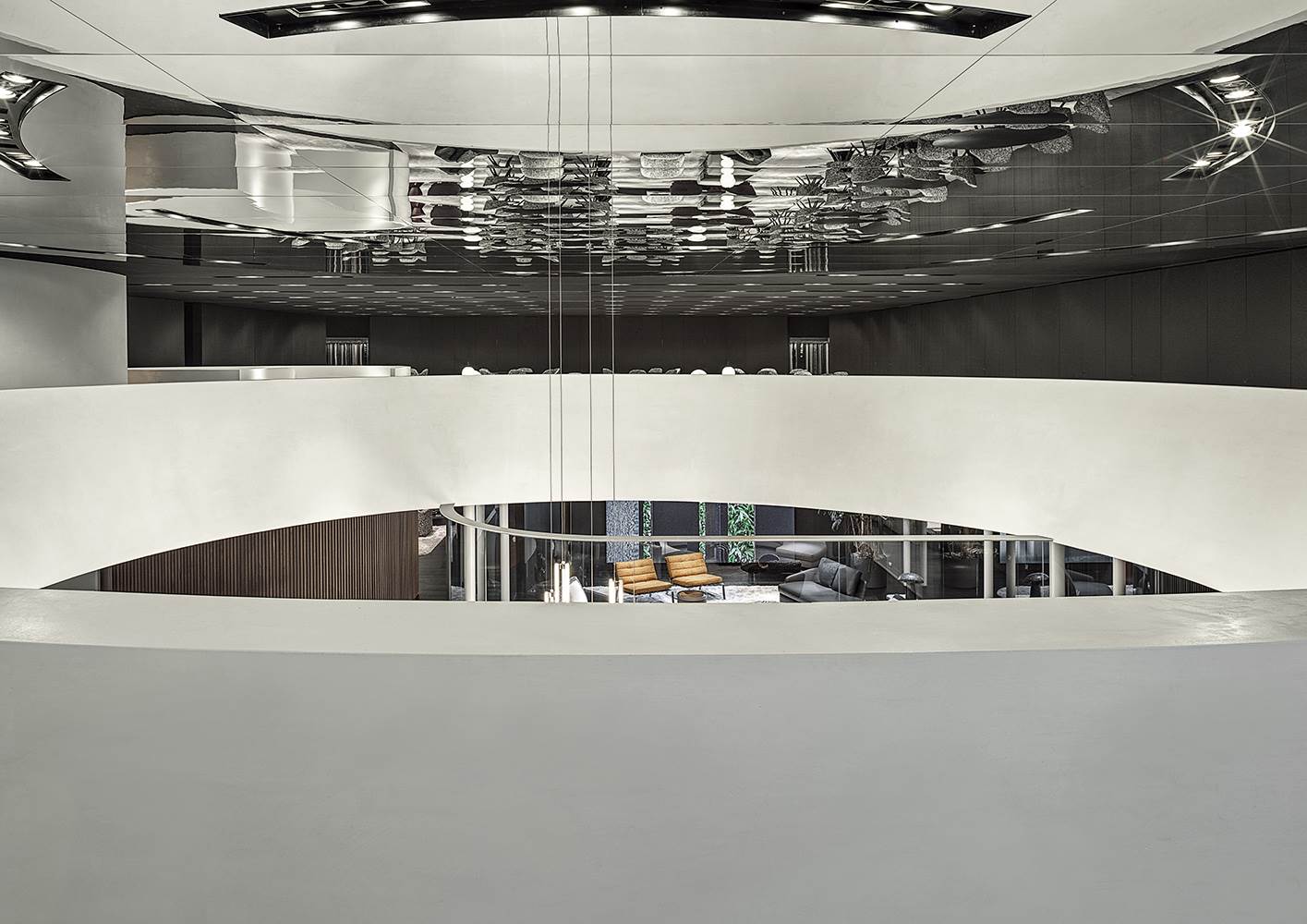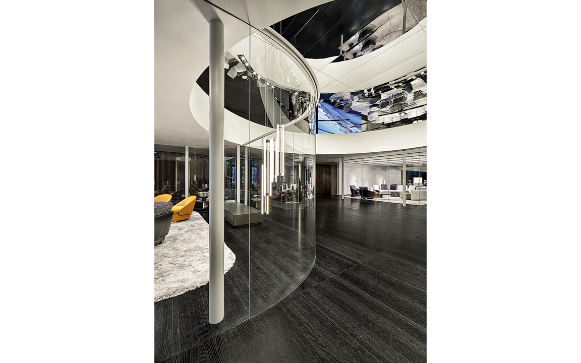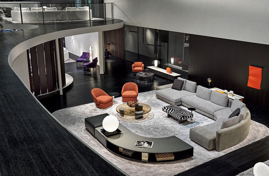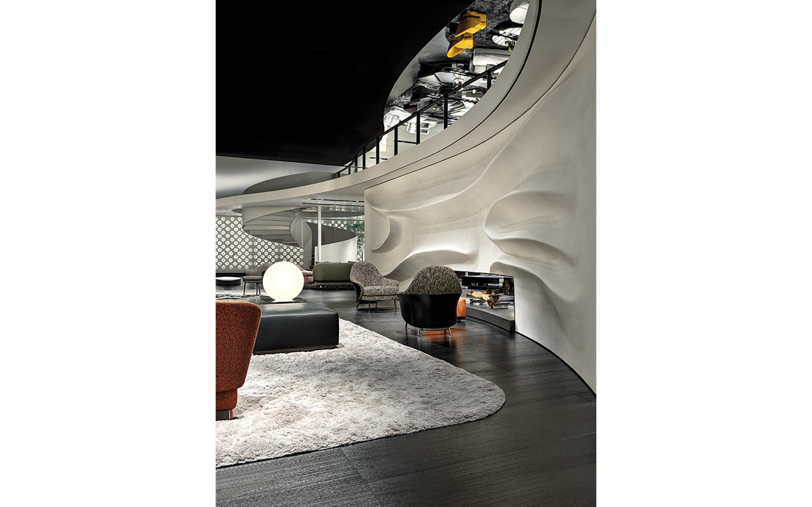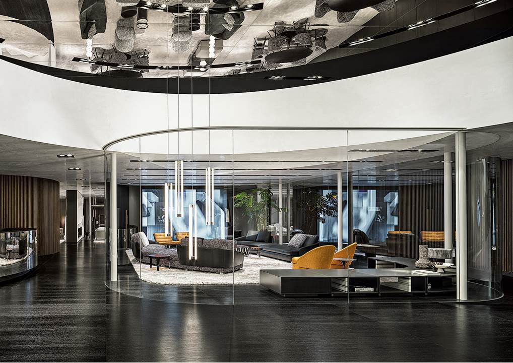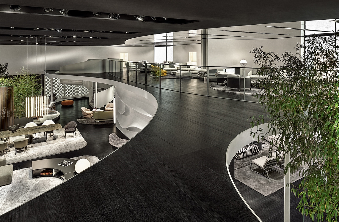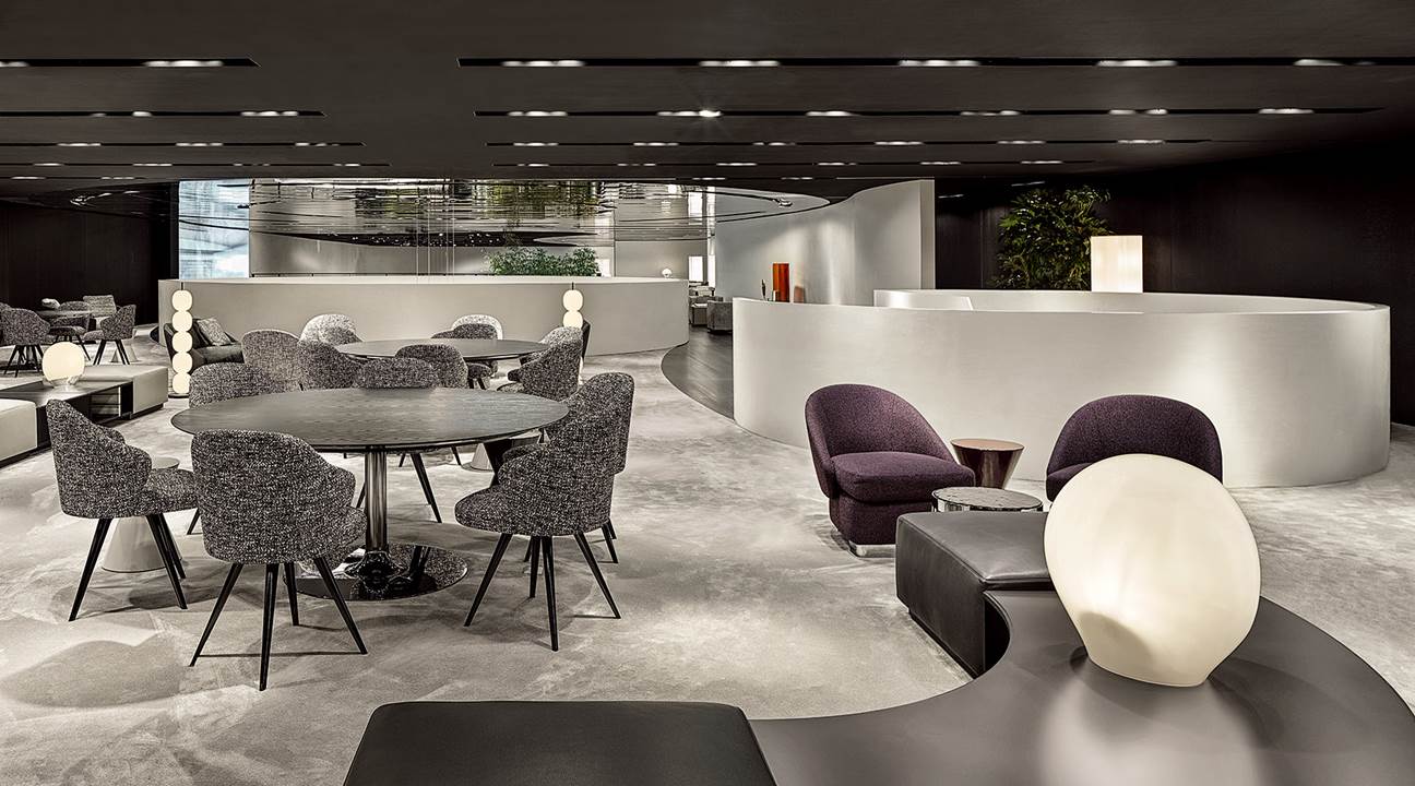 通过两个别致的螺旋楼梯,参观者可以来到上层空间,这里展出Minotti酒店设计项目的全新产品系列,为会话区和休闲区打造出优雅私密的氛围。