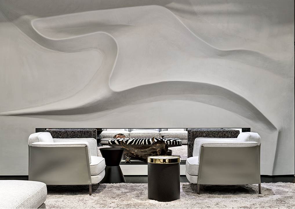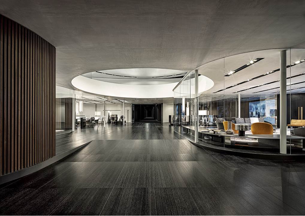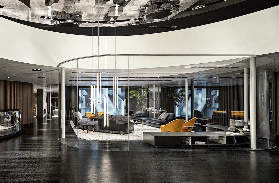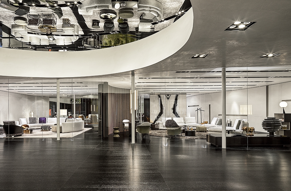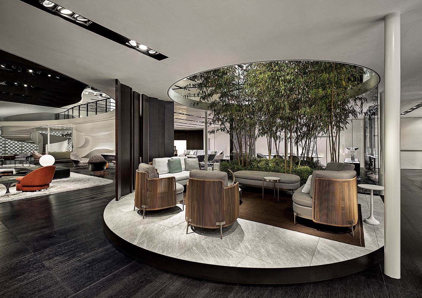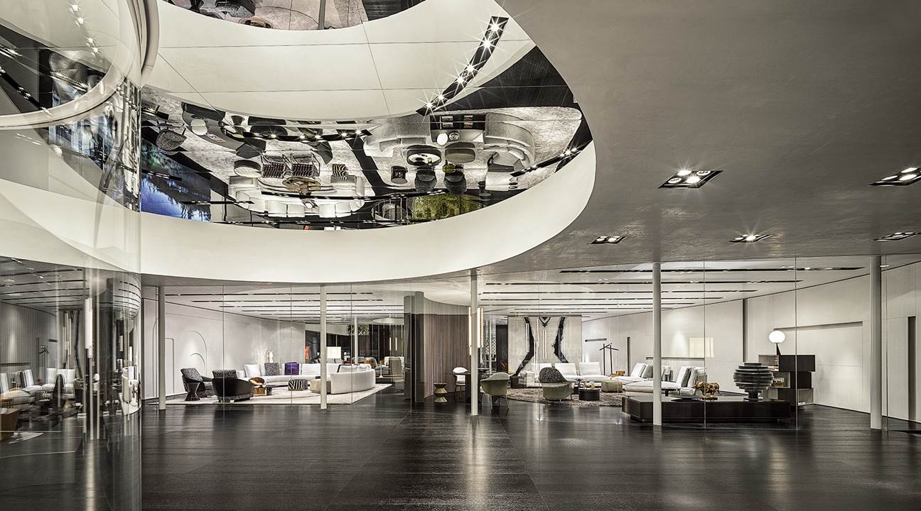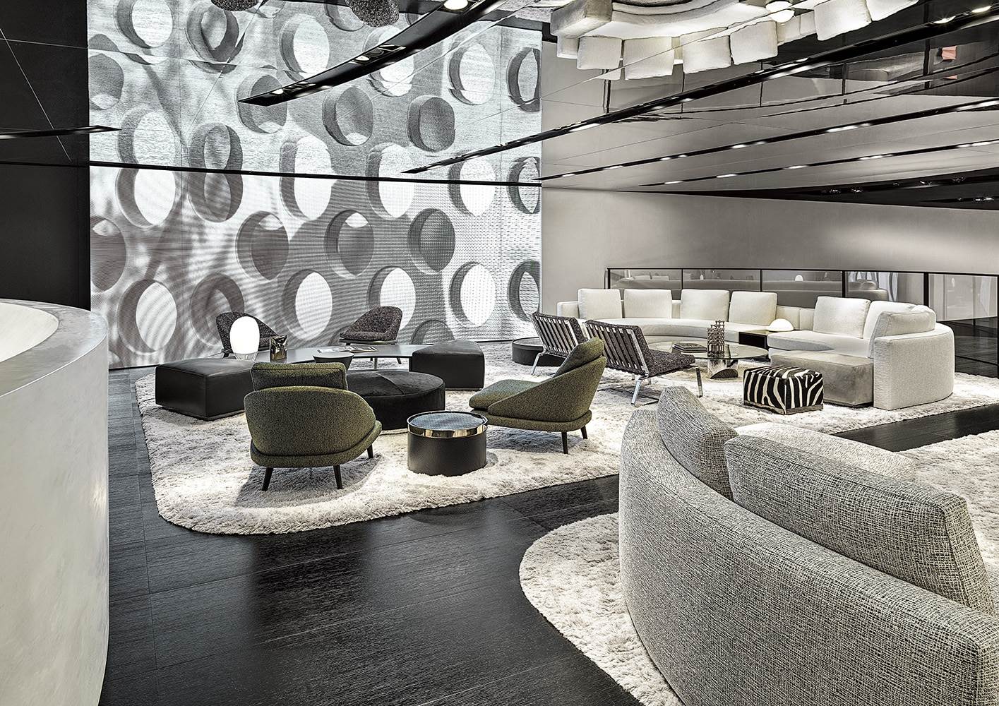 通过两个别致的螺旋楼梯,参观者可以来到上层空间,这里展出Minotti酒店设计项目的全新产品系列,为会话区和休闲区打造出优雅私密的氛围。