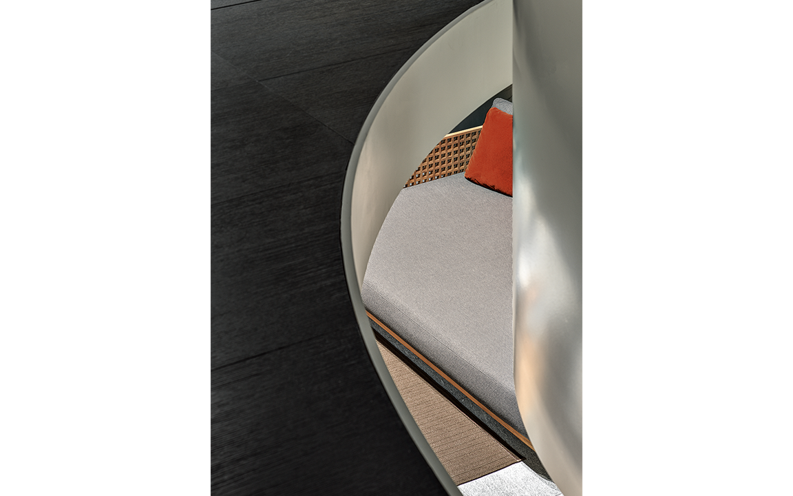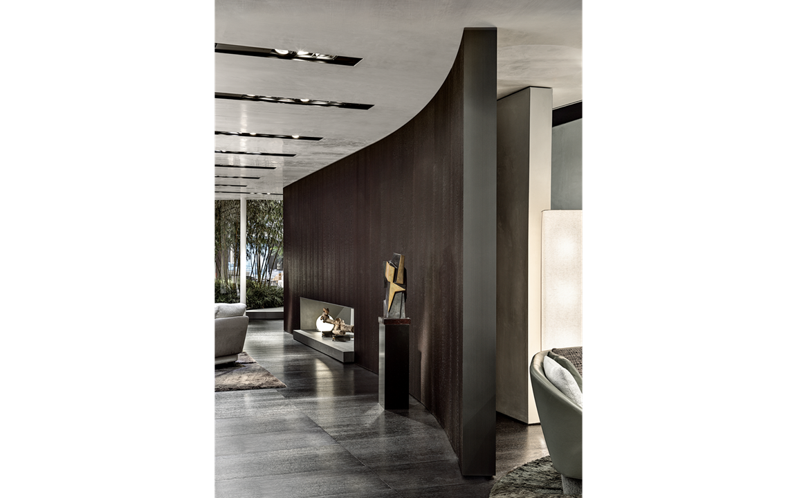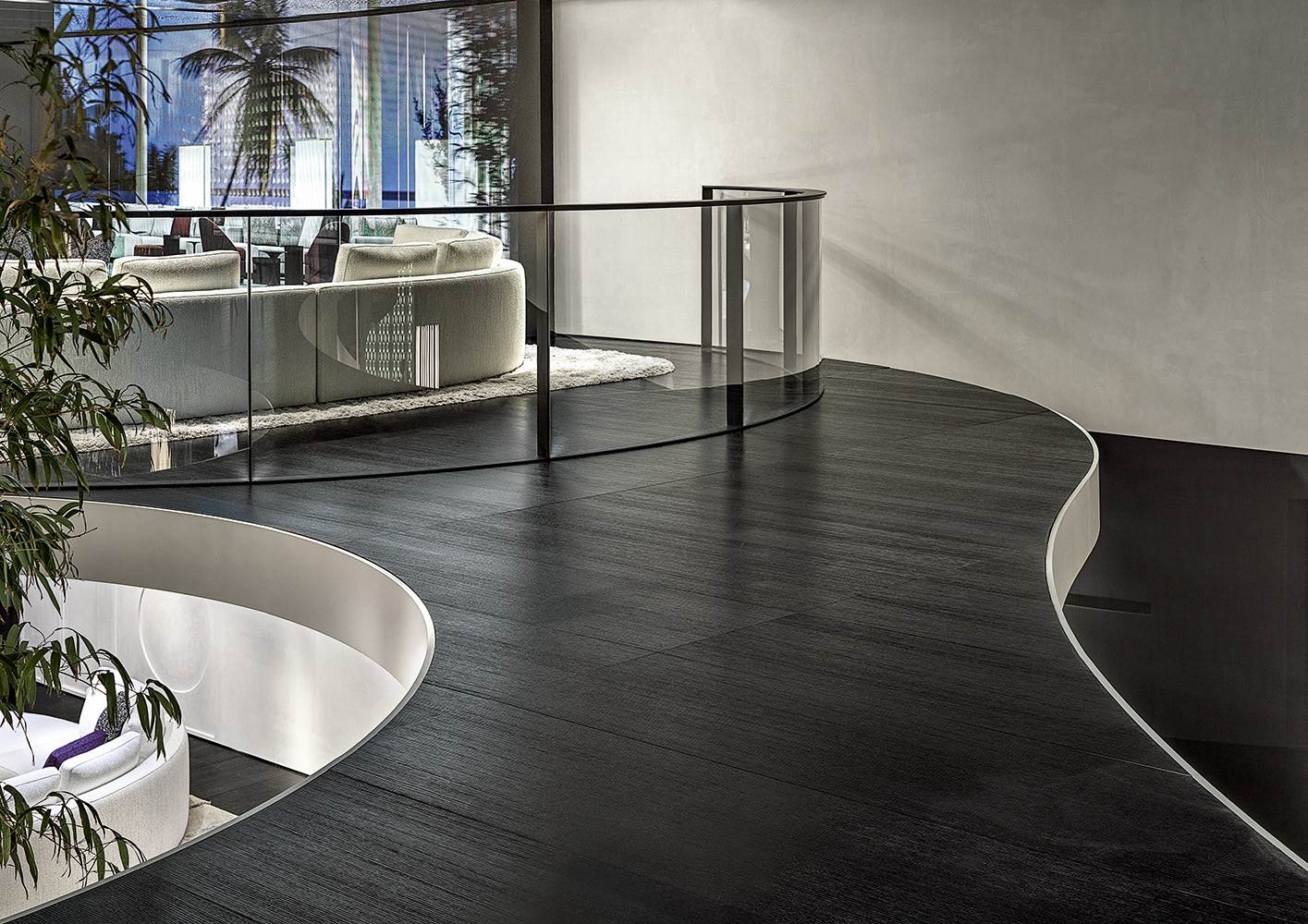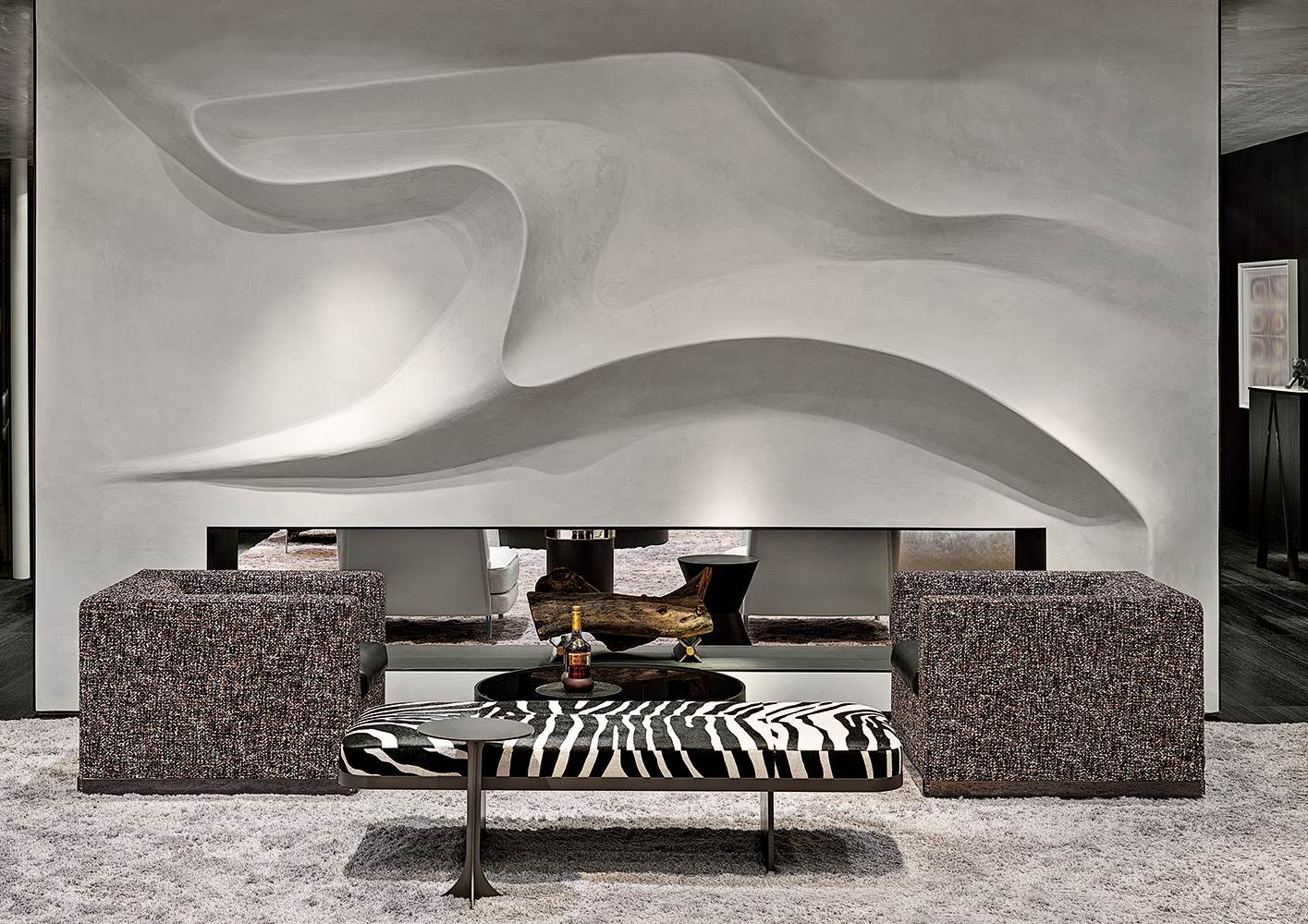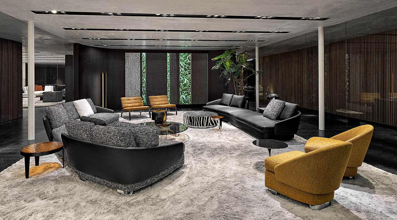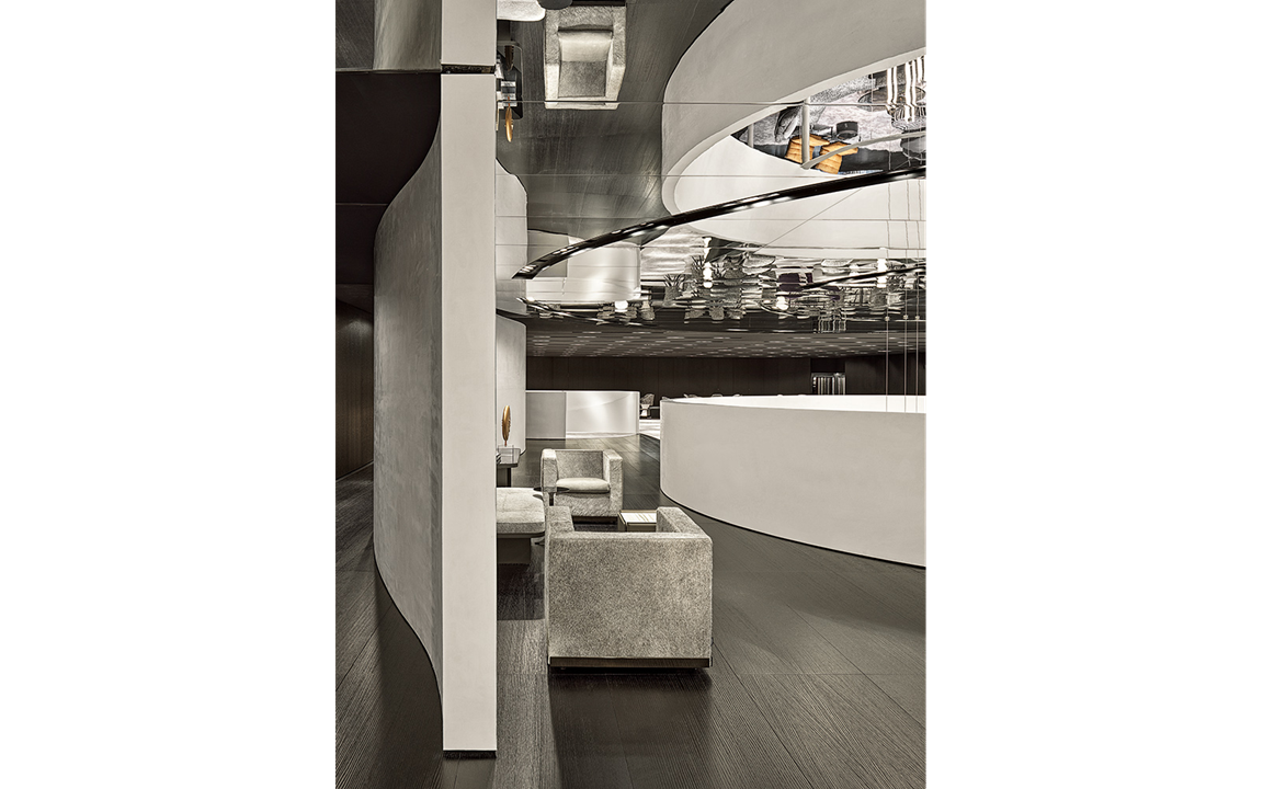 通过两个别致的螺旋楼梯,参观者可以来到上层空间,这里展出Minotti酒店设计项目的全新产品系列,为会话区和休闲区打造出优雅私密的氛围。