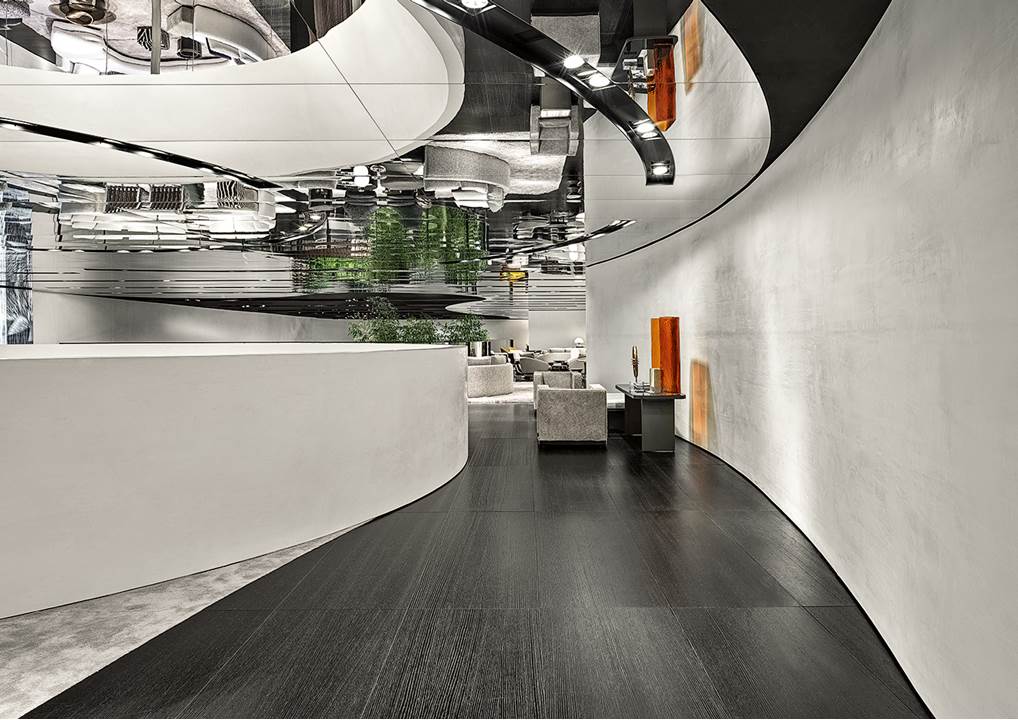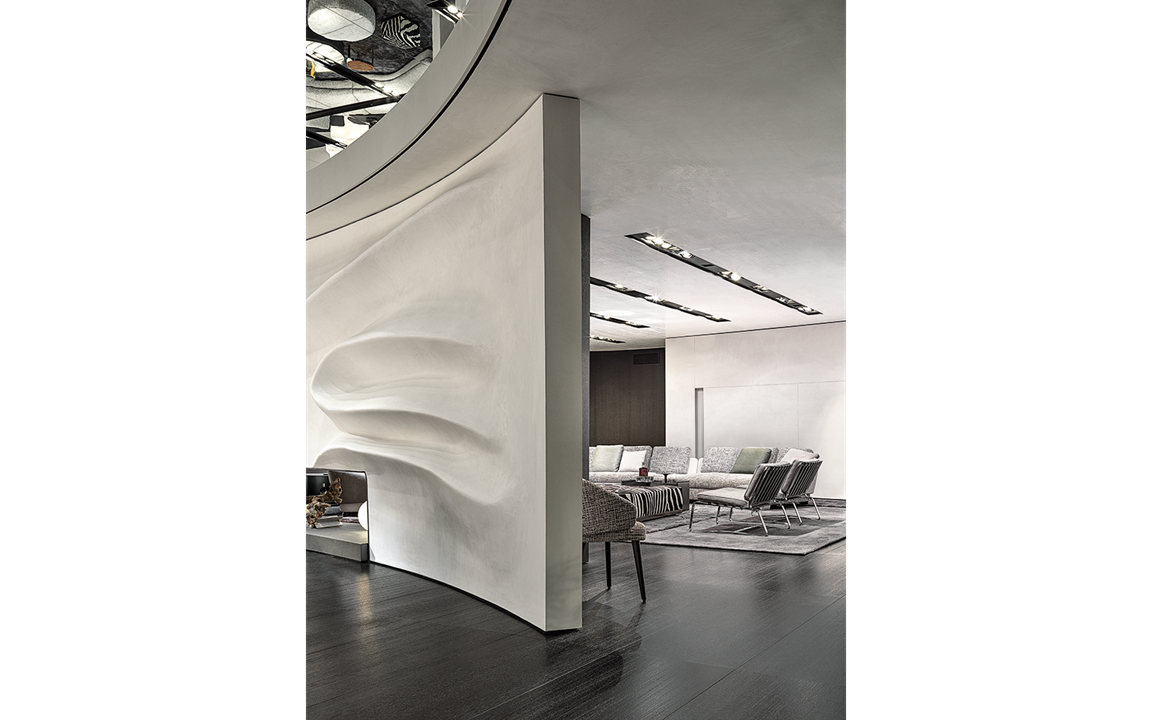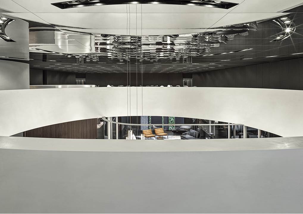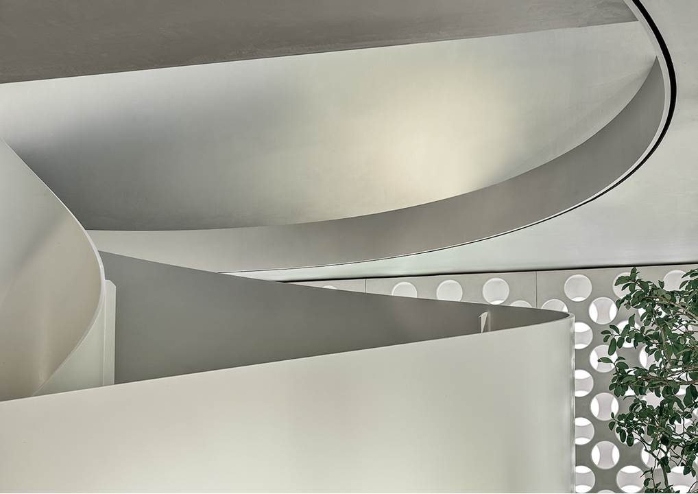 项目采用有机流线造型来演绎极具视觉冲击力的设计语言,空间设计运用曲线元素,通过白色石膏来突显表面的三维立体效果,创造出充满动感的迷人场景,运用2000平方米的两层空间来讲述其特质所在。
