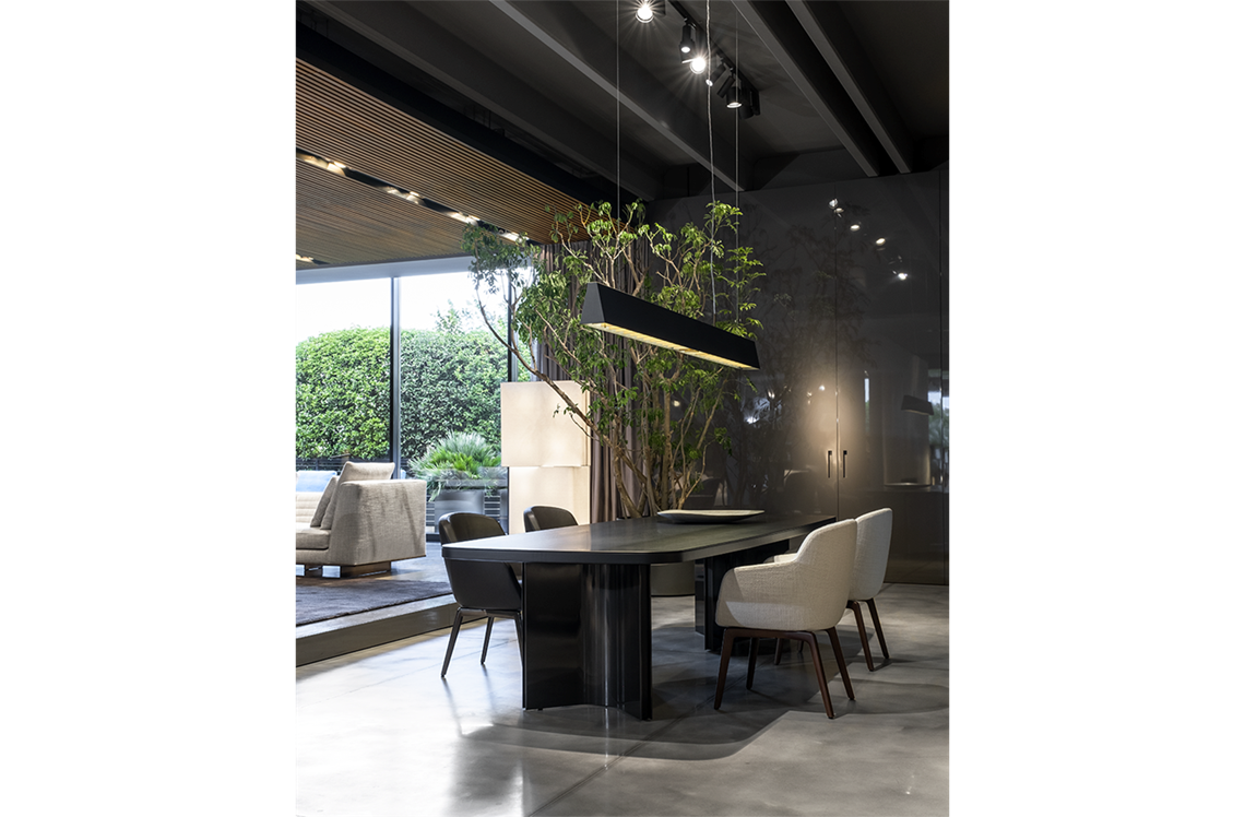 前方的三个休闲区也展示出Roger沙发座椅组合的多种配置方案,有大尺寸的L型组合,也有小尺寸的线性方案。岛形餐厅则摆放着Marcio Kogan / Studio MK27设计的Superquadra餐桌,其简约的线条结合非比寻常的比例设计,桌面采用深棕色Santos花梨木搭配Sahara Noir大理石,可谓创意十足。