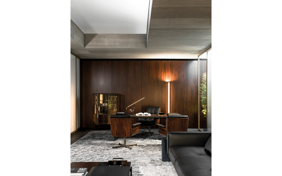 一个极具视觉效果的通道将公司展厅与SuperSet连接在一起,后者完全体现出2021系列的建筑和美学理念,其构造从理性主义和粗犷主义中汲取设计灵感,并通过温暖的材质来加以平衡,例如:蜂蜜色橡木的门窗框、具有折射效果的亚光钢制表面、深棕色Santos花梨木的墙板。