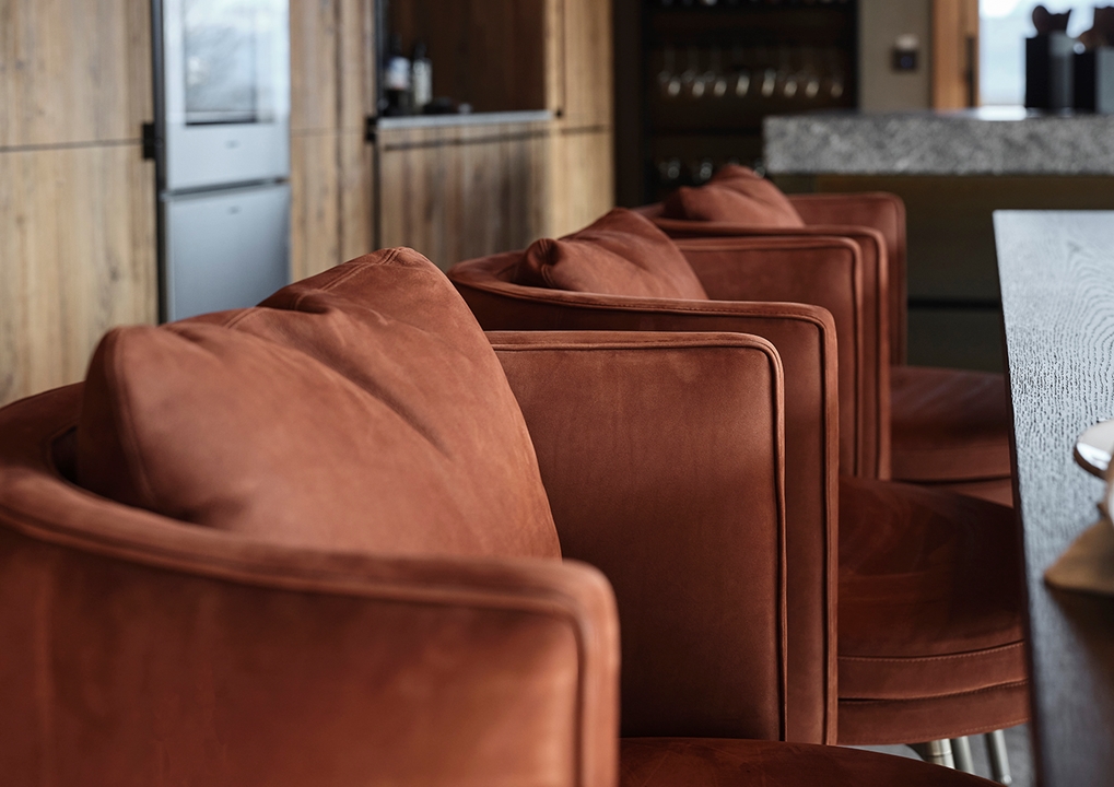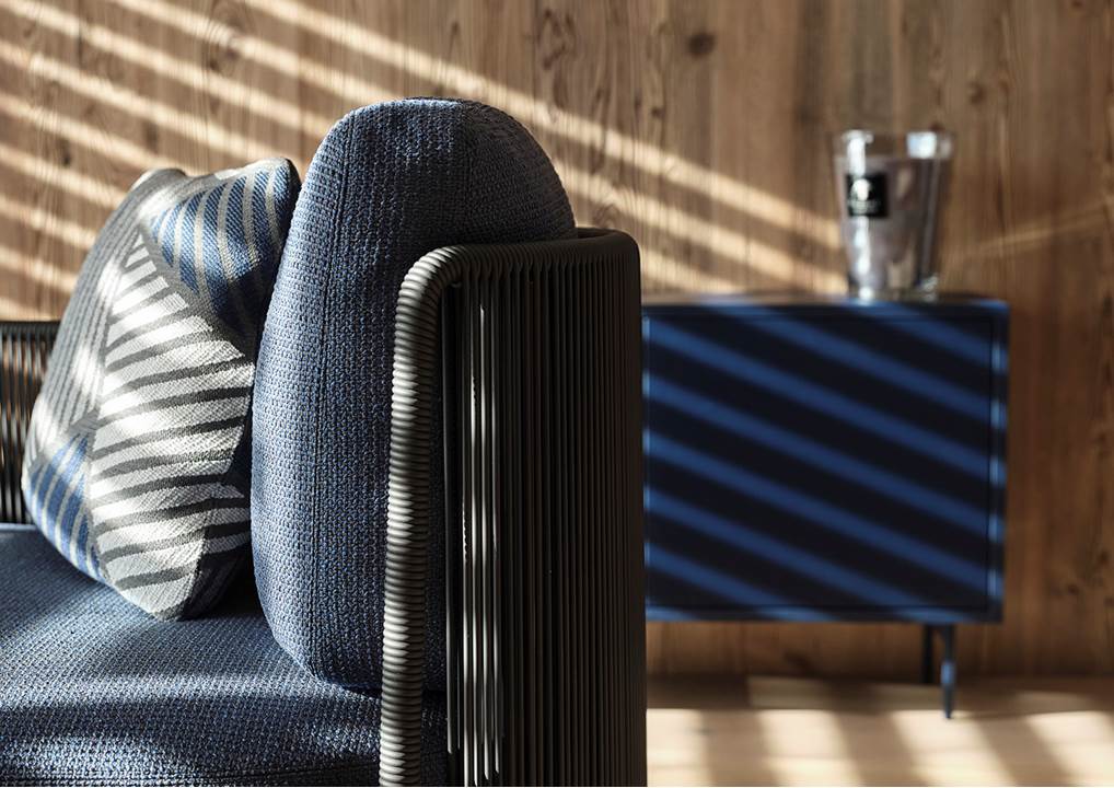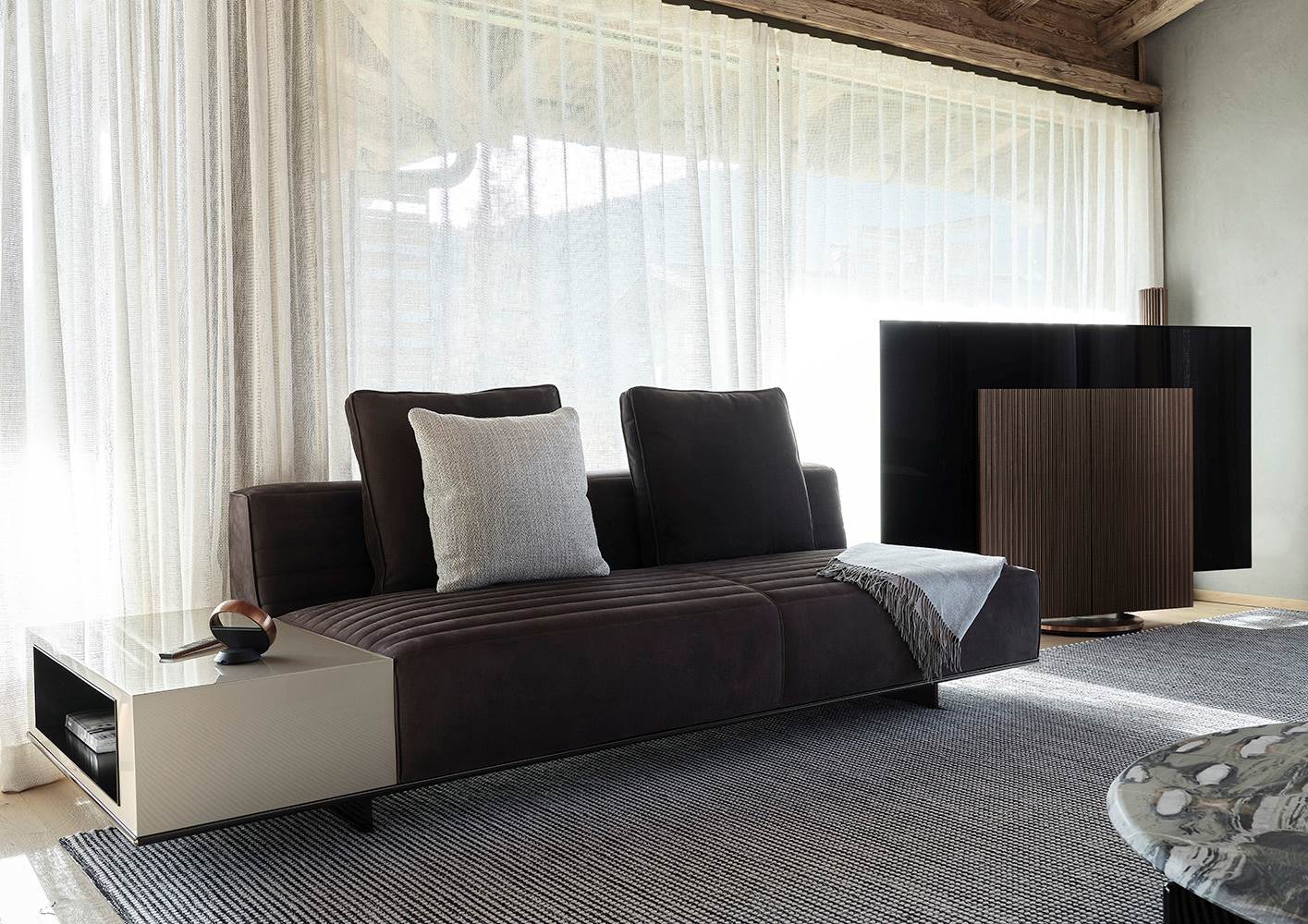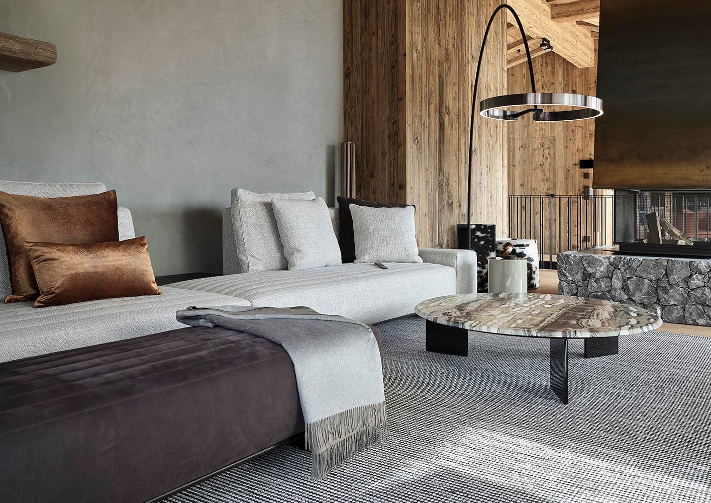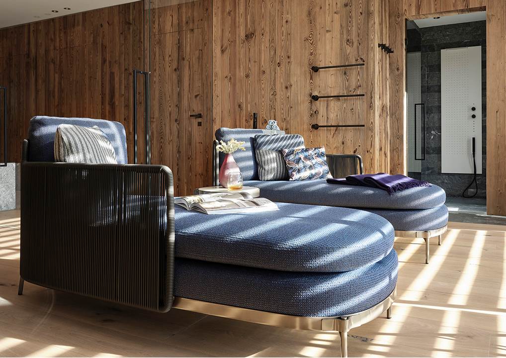 传统的原材料结合现代的技术解决方案,为这座地处绿色山峦之间的小木屋带来了非凡的舒适度和精致的美感。空间设计倍显温馨:从生活区到三间客房,每间客房都配备独立卫生间,再到桑拿房和土耳其浴室的大型康体区,还有直接通往游泳池的户外露台。设计方案所选用的Minotti家具进一步加强了室内和户外之间的连续性,家具的设计正是为了在家居空间与户外环境之间创造一条共同的主线;因此,Rodolfo Dordoni设计的造型严谨的Roger座椅系列、Marcio Kogan / Studio MK27设计的Superquadra吧台可以与邻近的康体区所摆放的Tape Cord Outdoor休闲躺椅进行对话,后者呈现出灵动的线条,由Nendo设计。无缝衔接的整体感不仅体现在视觉上,还体现在触觉和感觉上:木地板的温暖感延续到Minotti Studio设计的Osaka羊毛地毯上,赤脚行走亦无拘无束,Rodolfo Dordoni设计的Keel咖啡桌所选用的石材将户外的山峰脉络带入室内的家居空间。