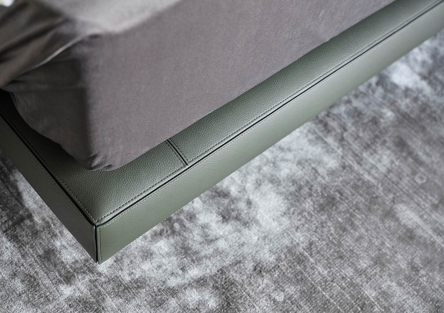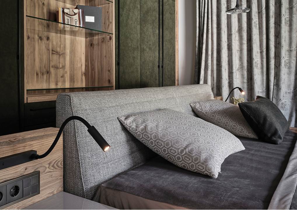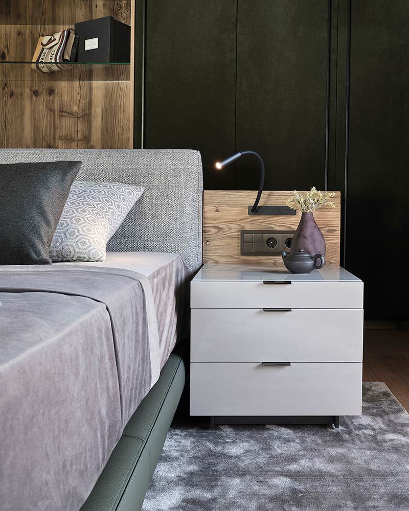 主卧室与起居空间相邻,具有强烈触感的皮革和织物为其增添一份温馨的氛围:Rodolfo Dordoni设计的Roger睡床将素雅的皮革基座与经编织物材质的床头板结合在一起,融入温馨感。Harvey Line床头柜玩转纹理之间的平衡感,它也是Rodolfo Dordoni的设计作品。