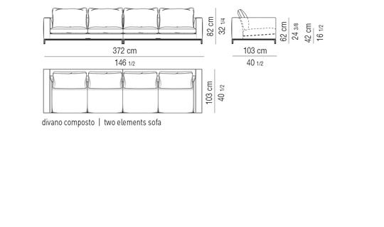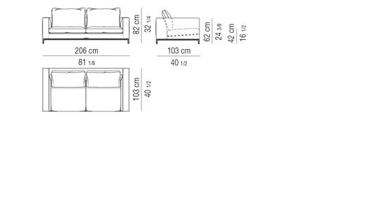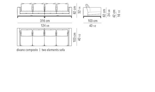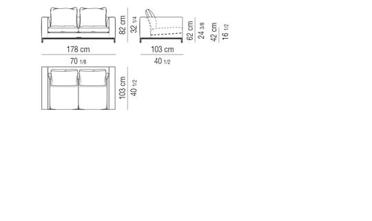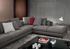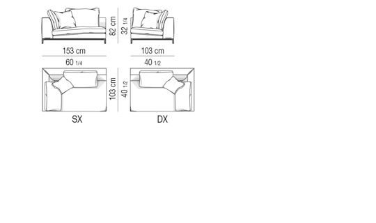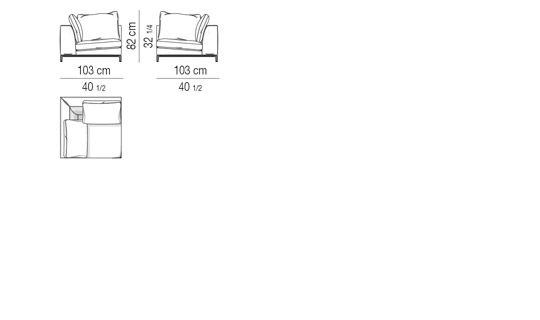 Thick seat cushion padding in goose down divided into sections, for increased cushion softness. Resilient polyurethane foam insert, covered - in the upper part - with “thermosensitive” polyurethane material. Backrest cushions fully padded with goose down divided into sections. Armrests covered on internal side with quilted channeled goose down, which results in enhanced softness, thereby making the armrests look like cushions.
