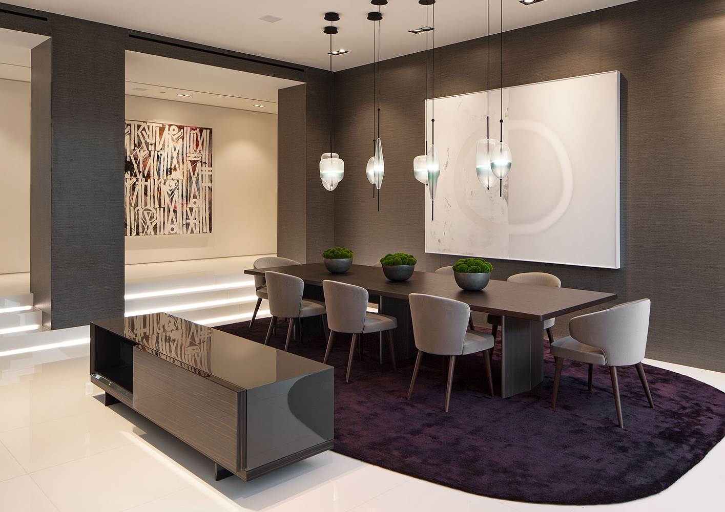 在开放空间中,用餐区选择了Morgan餐桌,其设计让人联想到修道院食堂的传统Fratino餐桌,搭配具有鲜明复古风格的Aston小扶手椅和座椅。地板上铺着Dibbets “Tonneau”地毯,其圆边造型别具一格,Aubergine色调倍显考究,此外,还通过Connors收纳柜的独特造型来划分出用餐空间。