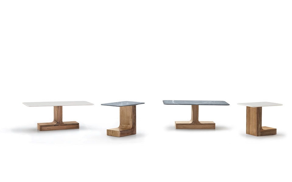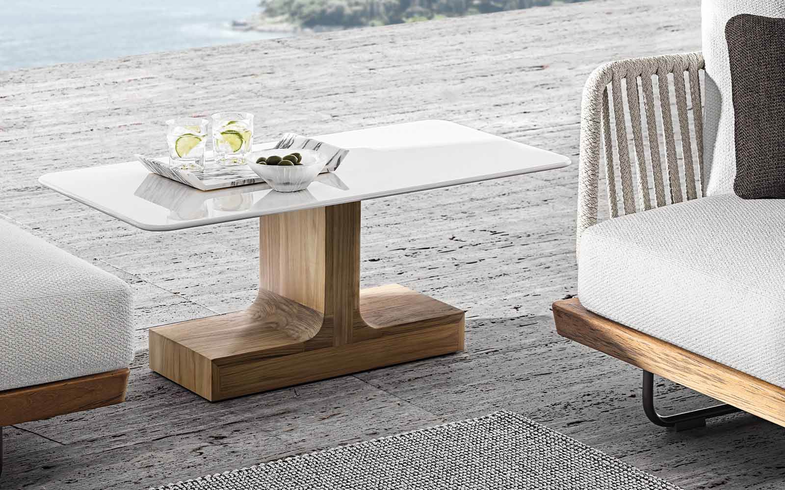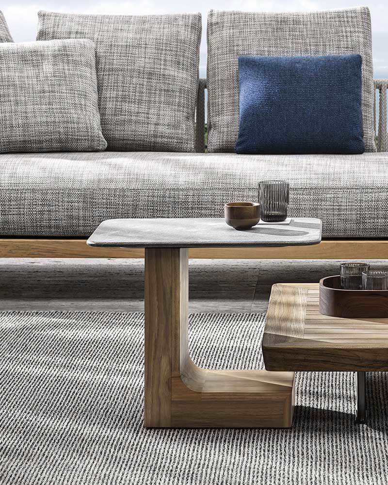 Block边几在户外版本中沿用实木块的结构,底座呈现“L”或倒“T”的坚实造型,但是材质为柚木。