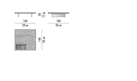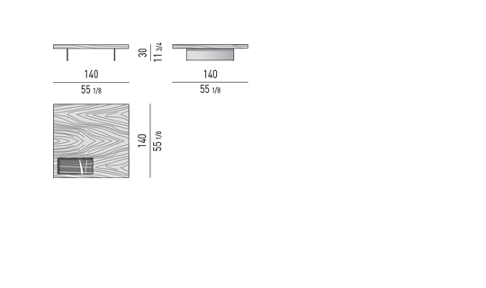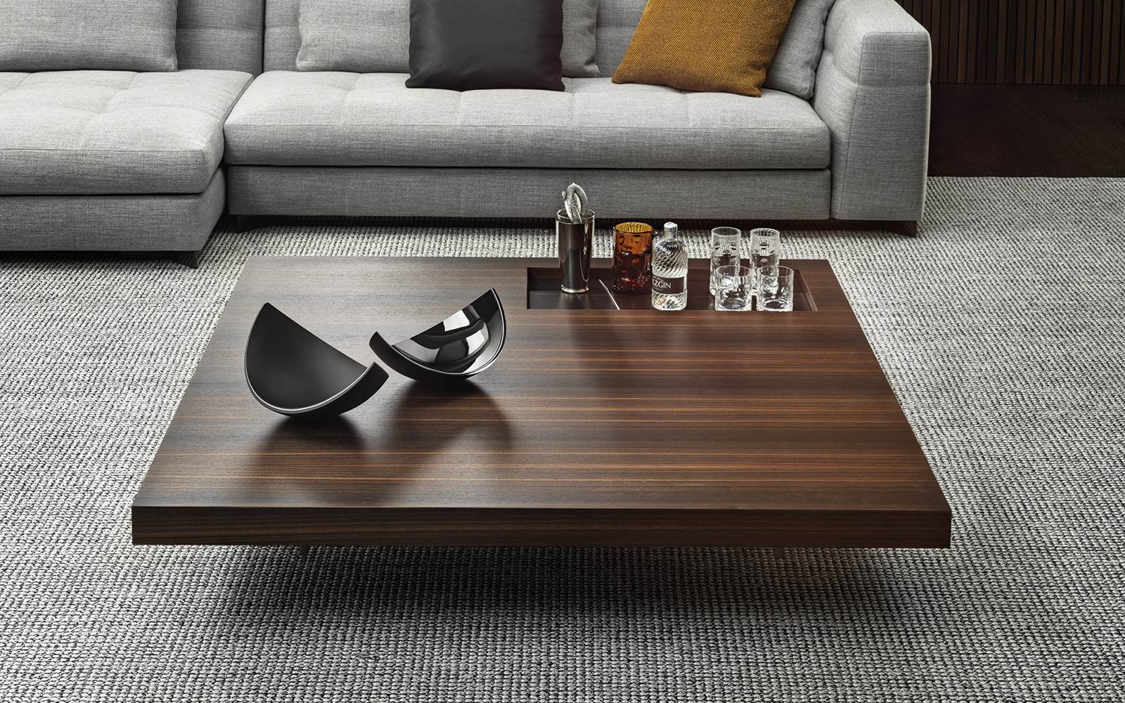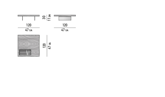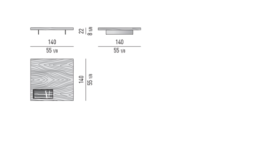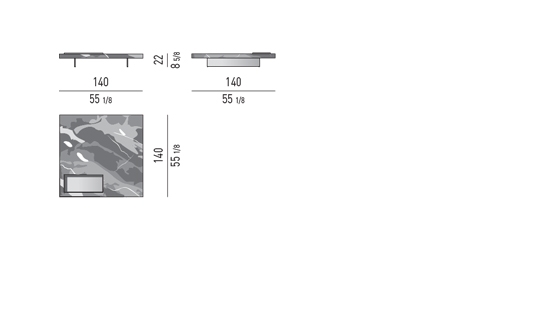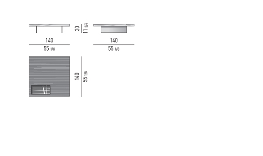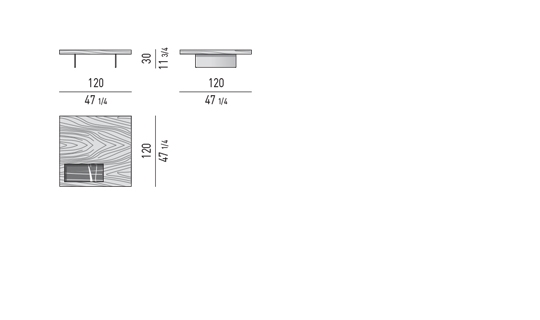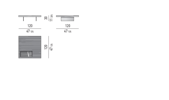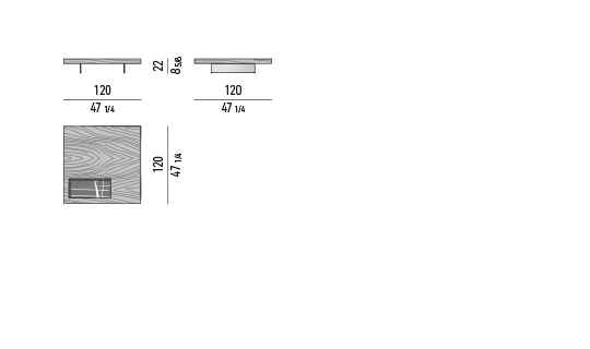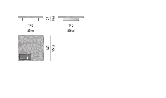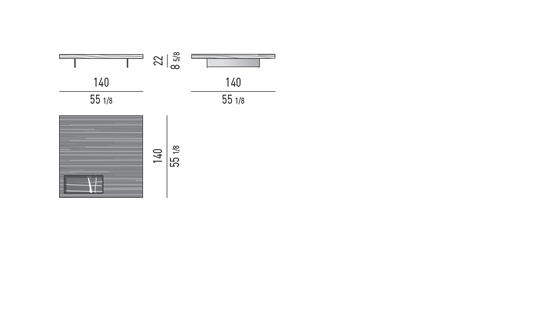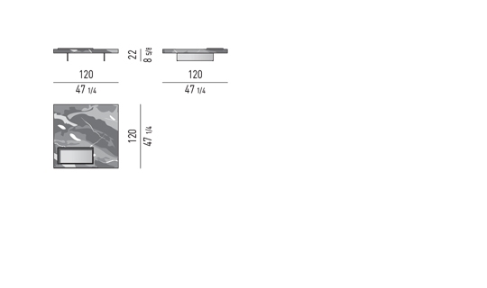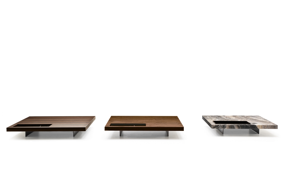 _ Grigio Orobico marble, 16 mm thick; _MDF, with 16 mm thick palisander Santos* veneer, stained Dark Brown with polyester matt lacquer finish (new 2021 finish); _ MDF, with 16 mm thick palisander Santos* veneer, matt polyester lacquer finish; _ MDF, with 16 mm thick eucalyptus veneer, matt lacquer finish. In the marble top version, the tray insert is in metal, varnished Golden brown colour (the tray measures 64x29 H4,5 cm and projects 15 mm above the top). In the wood top version, the tray insert measures 65x30 H4,5 cm and is set completely flush; the bottom is clad in a sheet of Sahara Noir marble, matt polyester finish.
