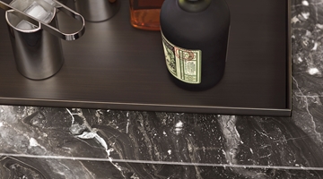Miter-fold boxed marble with miter folding, supported by a 5 mm thick aluminium honeycomb panel. Structural underpanel in 50 mm thick laminated MDF and fiberboard, clad in black colour laminate.