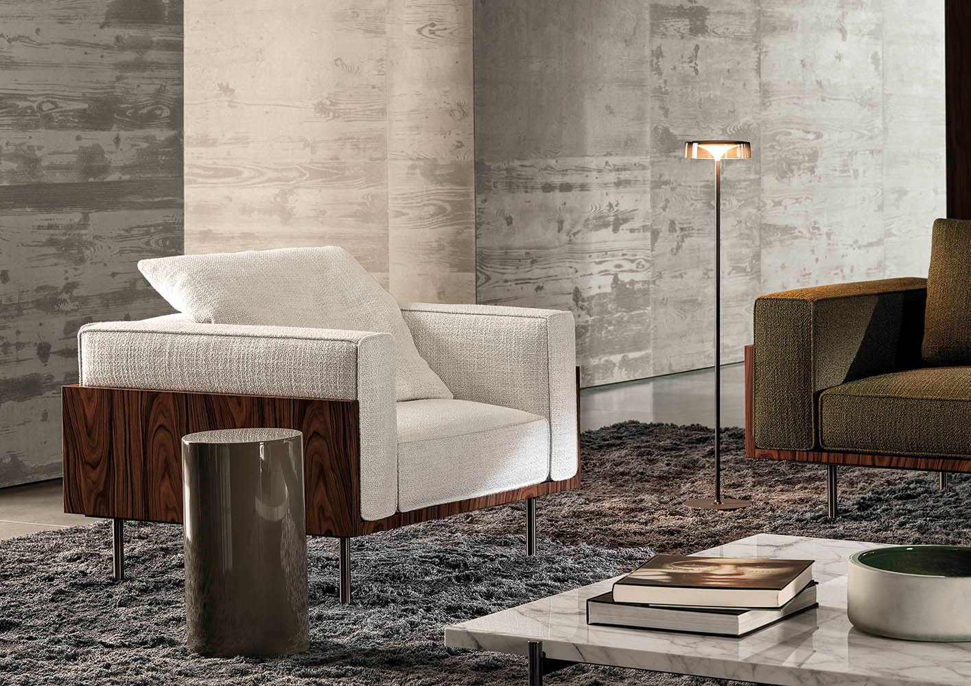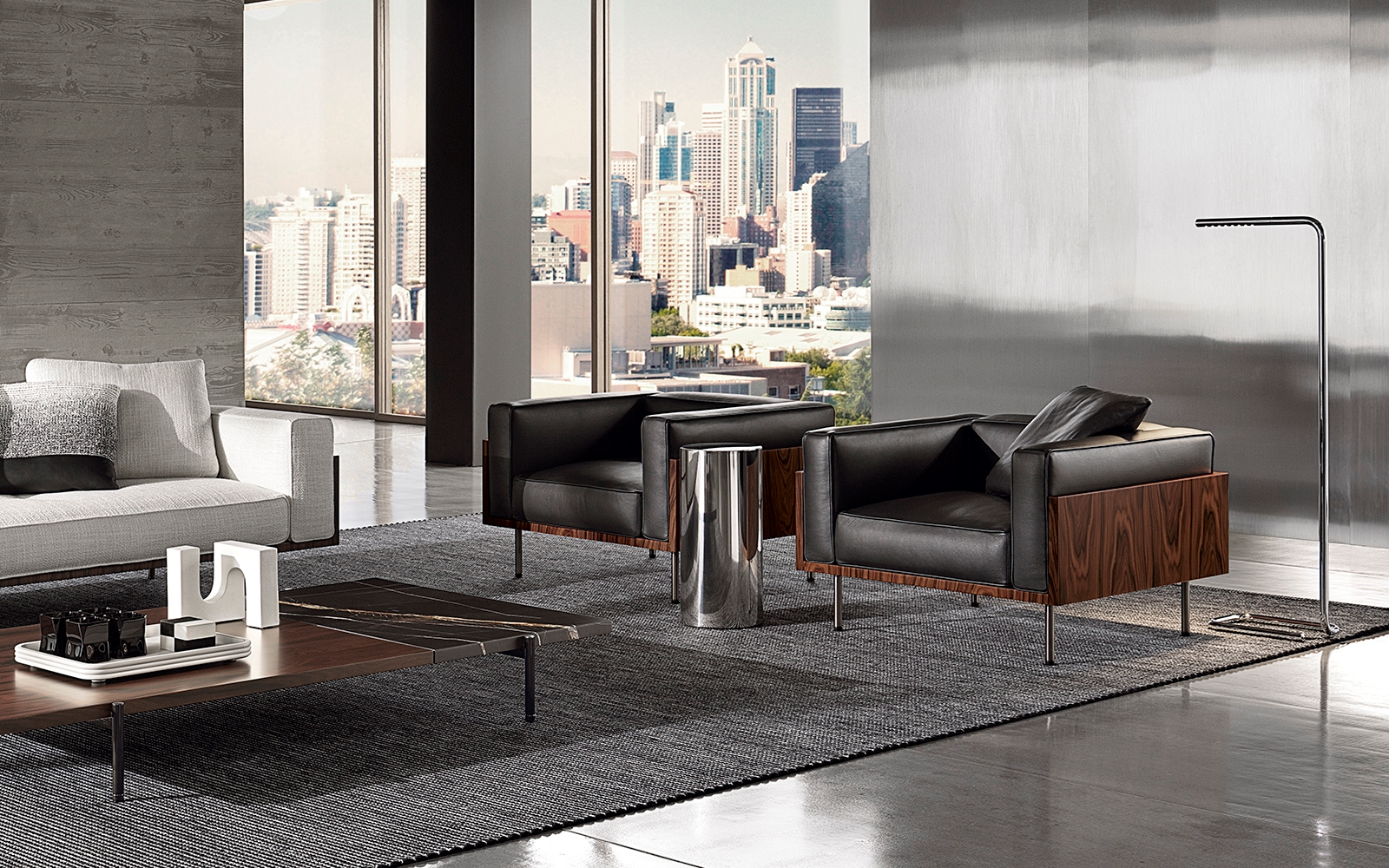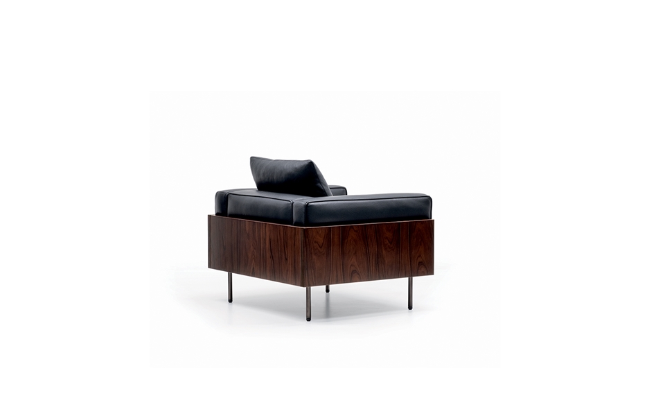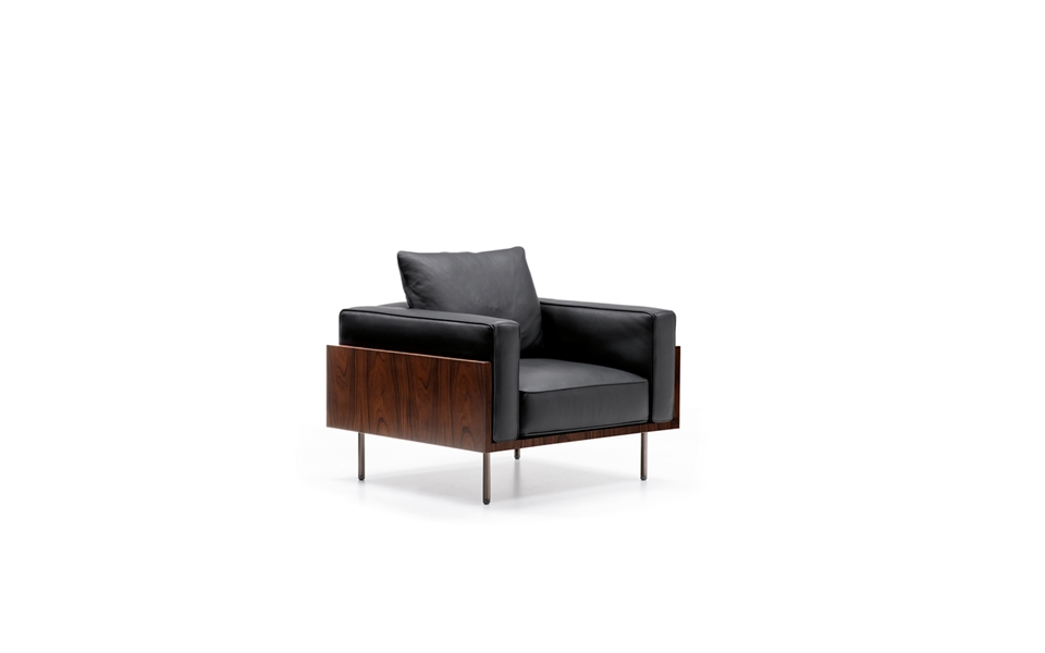 系列涵盖客厅与卧室家具,包括一系列一体式和组合沙发、扶手椅与脚踏,以及卧室组合方案。世纪中期现代主义风格经过改良,透过线条、廓形、深棕色 Santos 酸枝木等材质,以及考究的构造细节展现当代印象。