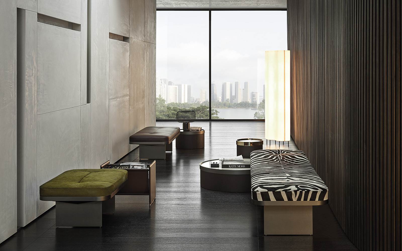 Clive长凳采用两片灰褐色亚光铝制支撑部件,方形凳面搭配弧形边角。灰褐色亚光金属带环绕软垫周围,效果仿若一顶皇冠。这一风格细节展现出顶级装饰工艺的应用。