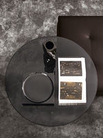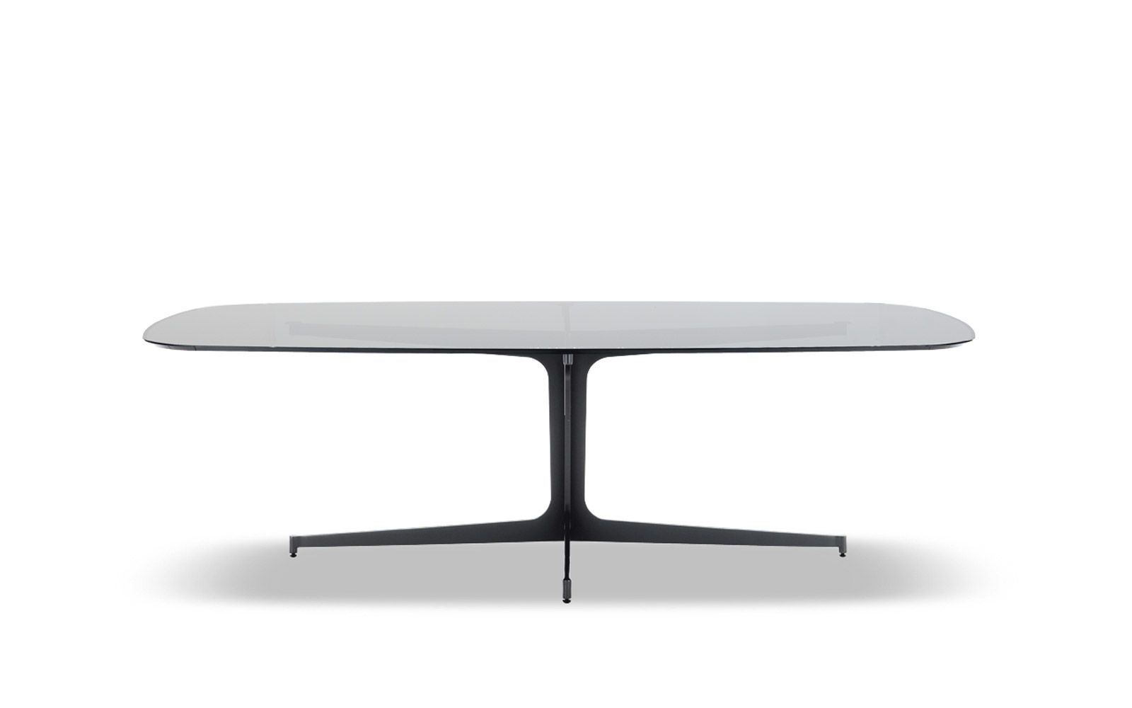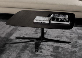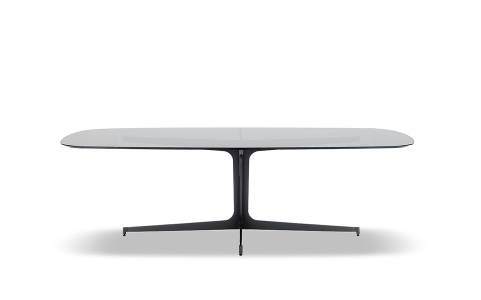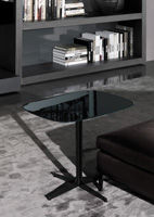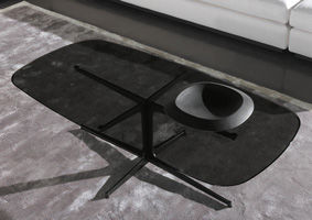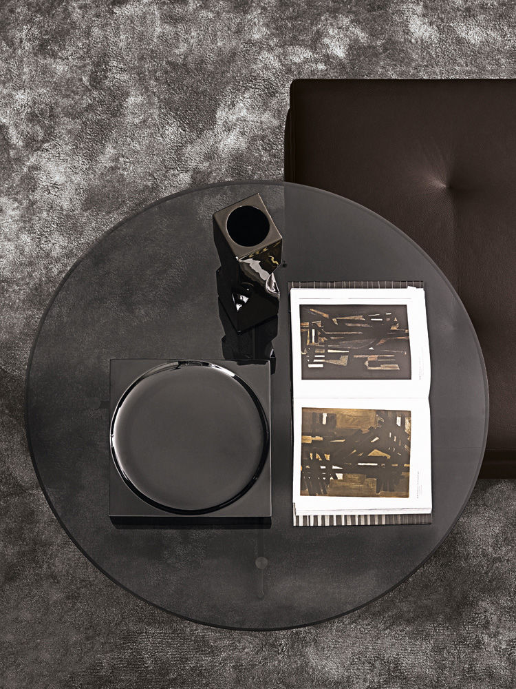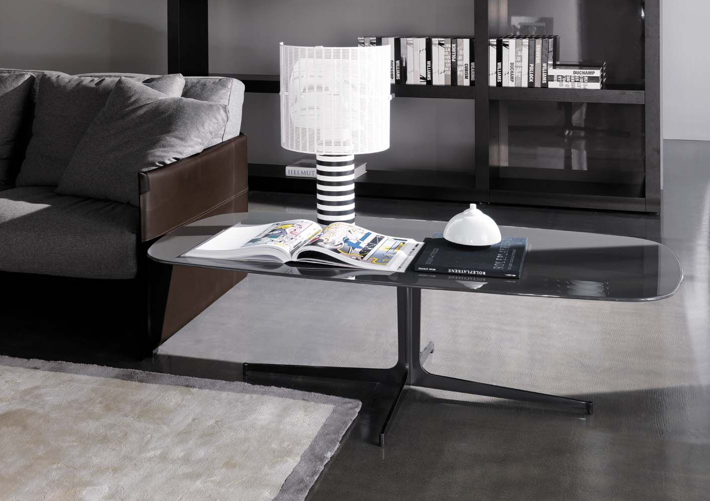 Glossy lacquered in Mud, Petroleum, Granite and Pewter colors; open-pore Moka lacquered oak; chamfered Smoked Grey tempered glass, 10 mm in thickness. The top is fixed to the structure by means of special metal supports.