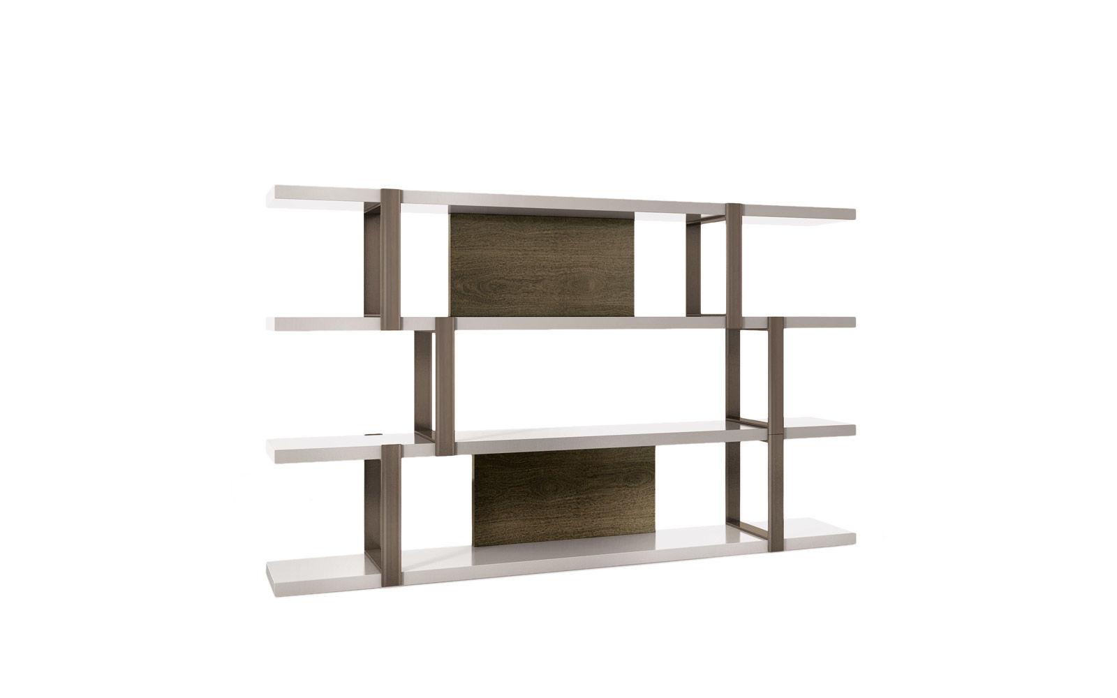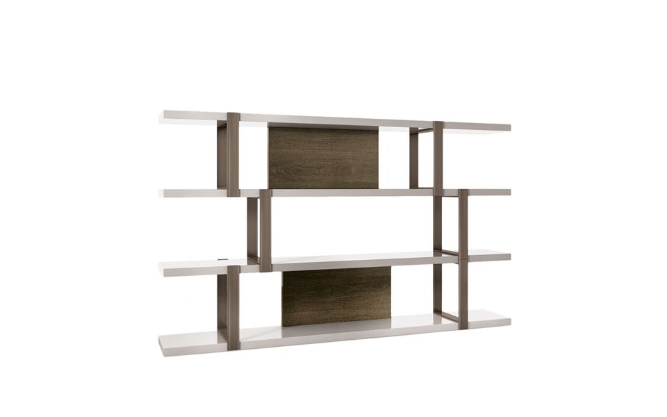 Dalton Bronze书架拥有一系列独具特色的饰面,打造出多种使用方案,开启全新的风格诠释理念。饰面有米灰色的鲍迪豆木饰贴面背板可供选择,搭配高厚度隔板,采用Warm Grey亮光漆。垂直支撑件为亚光金属材质,搭配铜色漆面。