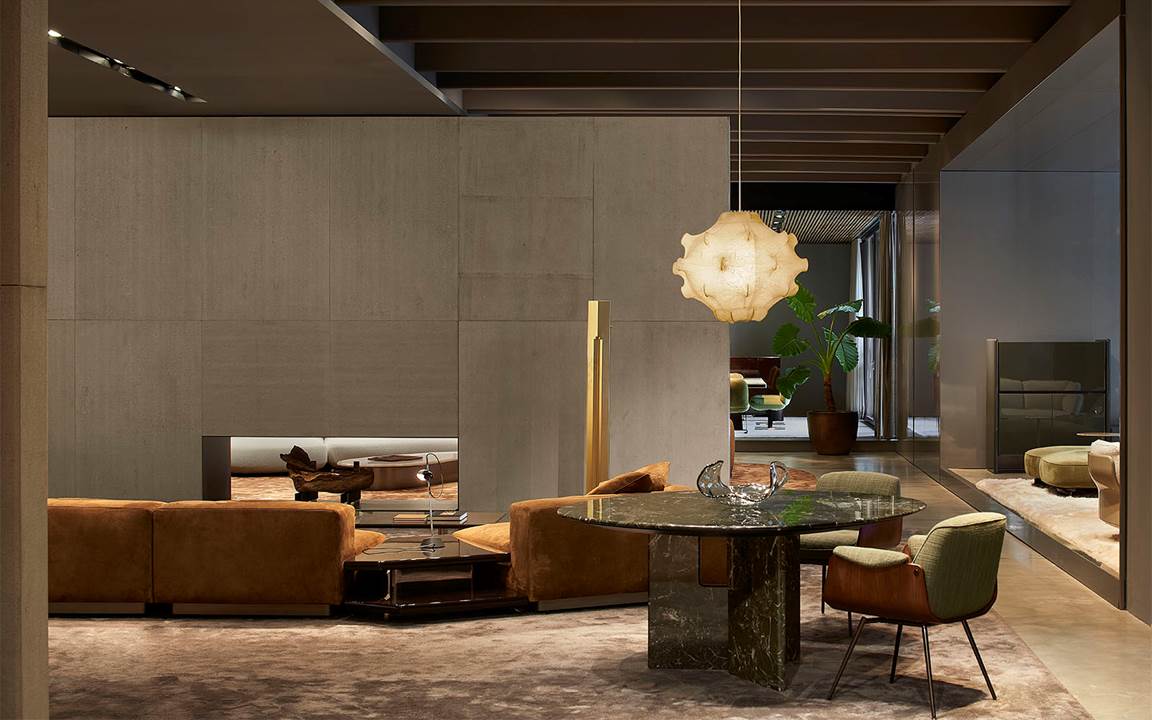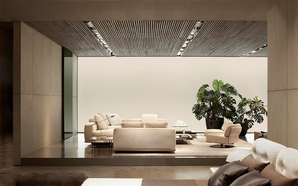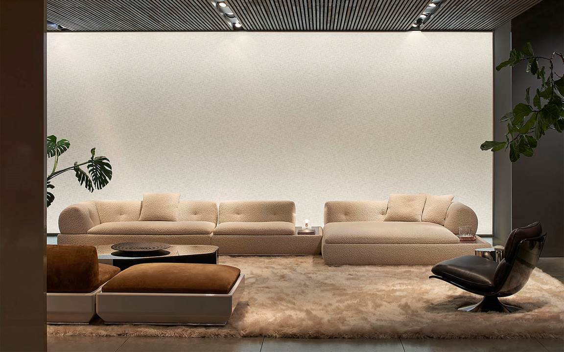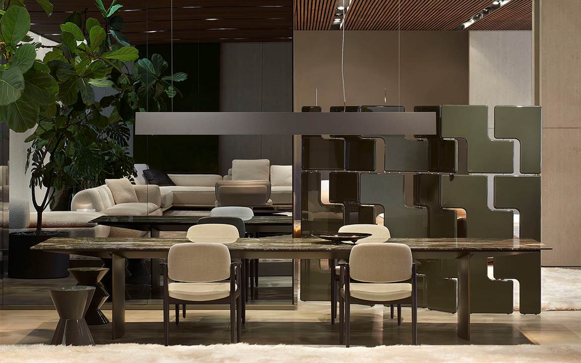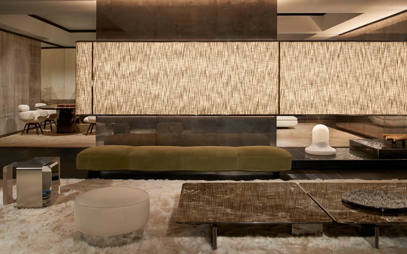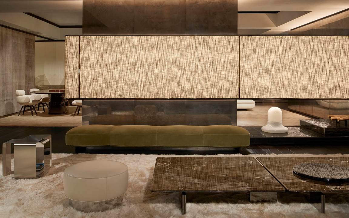 展厅空间由Minotti Studio策划设计,将整个1000平方米的区域打造成协调一致的场景,优雅的客厅、餐厅和卧室空间带来沉浸式的体验,彰显理想住宅和酒店环境的迷人氛围。