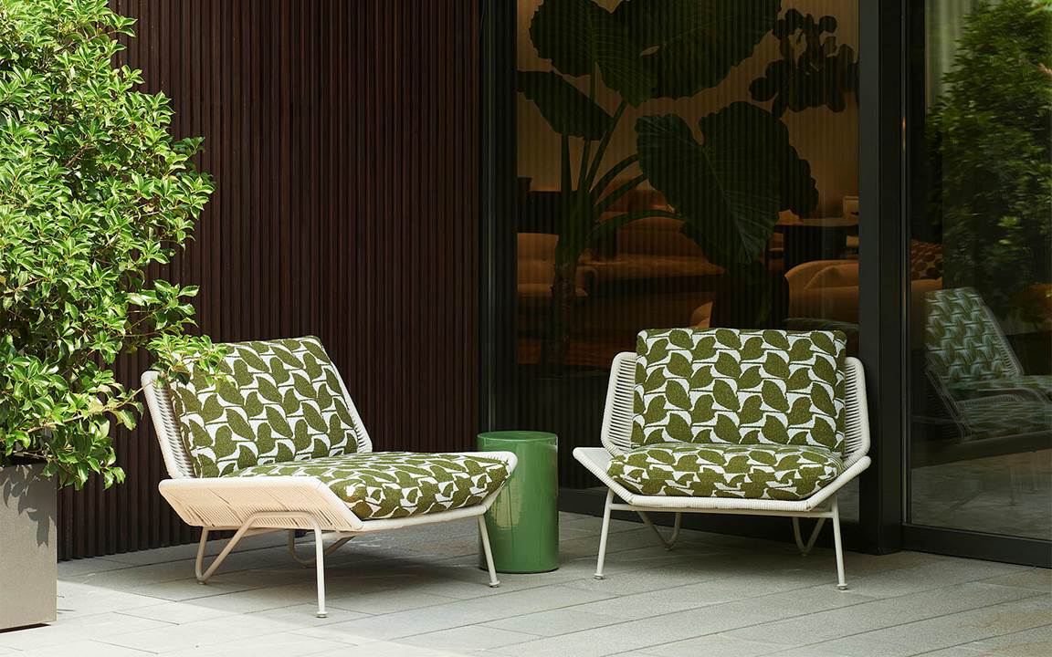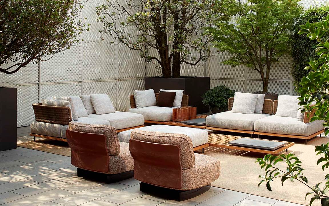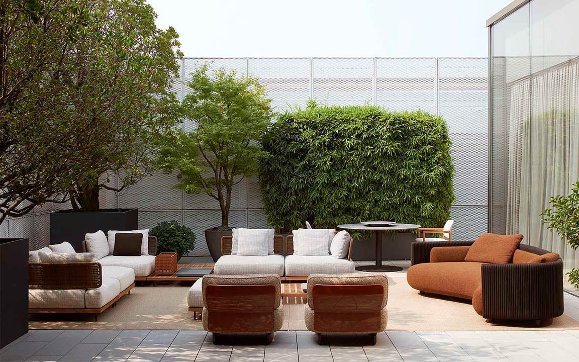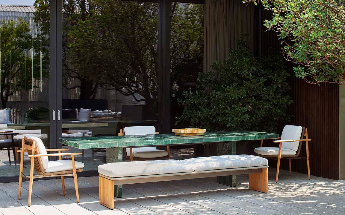 展厅的高大落地窗面朝露台,露台上摆放着户外新品系列,自然的色调使其与周围的环境相得益彰,在室内与户外之间形成流畅的过渡与转换。