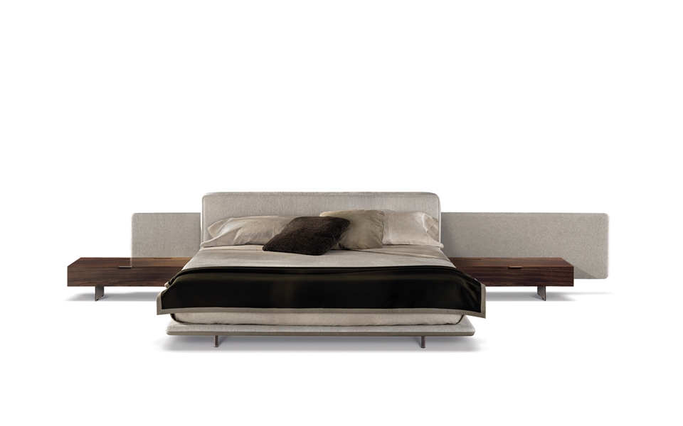 Horizonte Bed睡床与众不同之处还在于其轻盈的结构,这是因为Brandy色亮光漆面金属支撑腿采用靠后放置的设计,宽大的背板则成为床头柜的支撑部件,不仅有多种不同的木材可供选择,还提供齐平式和悬挂式两种设计方案。各种材料的巧妙组合、覆面的定制剪裁工艺不仅提供完全采用织物或皮革包覆的版本,还有将两者进行搭配的版本,为床架和床头板创造出不胜枚举的设计方案。