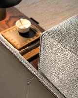 在睡床的设计中,水平线条化身为从地面升起的基座,床垫和床头板放置在基座上。床架将不同材料精妙地组合在一起,既可完全选用皮革或织物包覆,也可将两者以富有创意的方式进行搭配,创造出充满定制剪裁风格的优雅外观。完全采用皮革覆面的床架从高级定制领域汲取工艺灵感,通过束带将皮革部件缝制在一起。完全采用织物覆面的版本则在条带交界处采用别致的中央饰边设计。如果选用皮革与织物覆面相搭配的版本,则由一条拉链将两部分连接在一起,不仅形成一个美学图案,也可以快速实用地拆卸覆面。