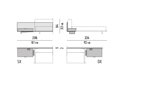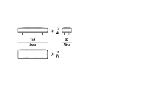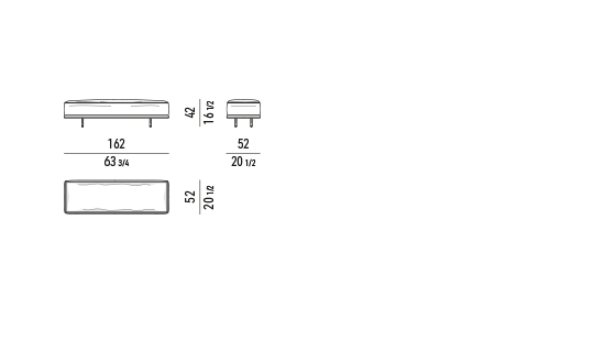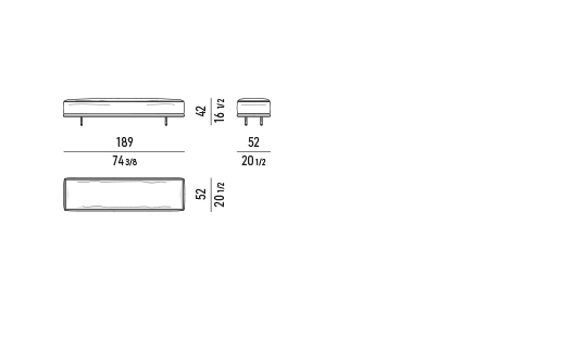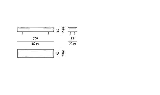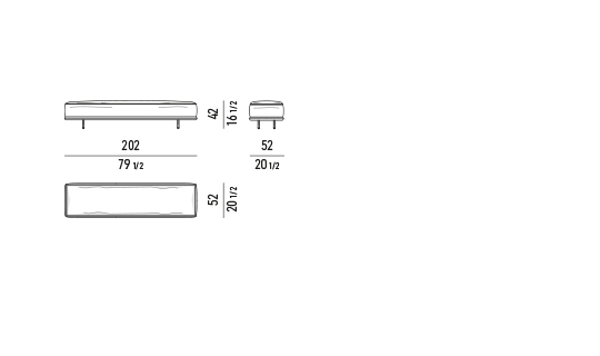 Structure: in plywood of various thicknesses. The structure is coated in high-resilience, variable-density polyurethane foam. The special upholstery on the base can be crafted in entirely in fabric, featuring an all-leather central trim element that marks the seam between the two sections, which are joined with a strip of double-stitched leather (tailoring technique used in fine luggage); or, with a lower section in leather and upper section in fabric, joined by a hidden zipper that allows the upholstery to be removed.