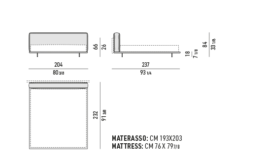 One-piece free-standing bed frame in very thick metal-reinforced plywood, drilled to facilitate aeration. An additional perforated technical fabric covering on the upper part of the bed frame allows greater circulation of air throughout the structure. The structure is coated in high-resilience, variable-density polyurethane foam. The one-piece headboard is made of plywood with high-rubber-content elastic webbing, covered in high-resilience, variable-density polyurethane foam, then encased in breathable quilted heat-bonded polyester fibre laminated to hypoallergenic white cotton fabric. Inside the quilting is a bag padded with siliconised microfibre - with low coefficient of friction - which completely conforms to the structure; this very soft fluffy padding is obtained from certified 100% recycled PET.