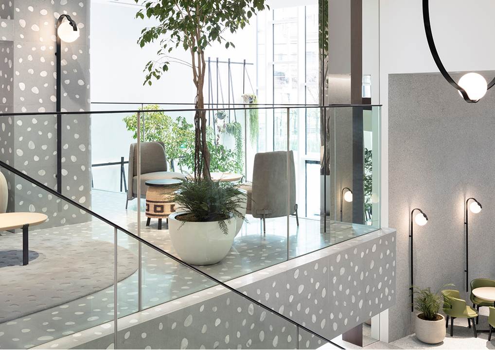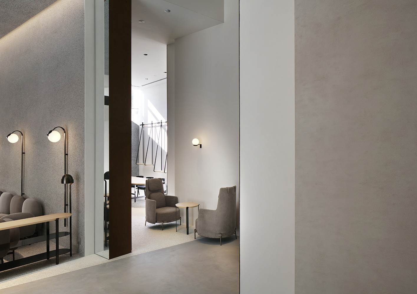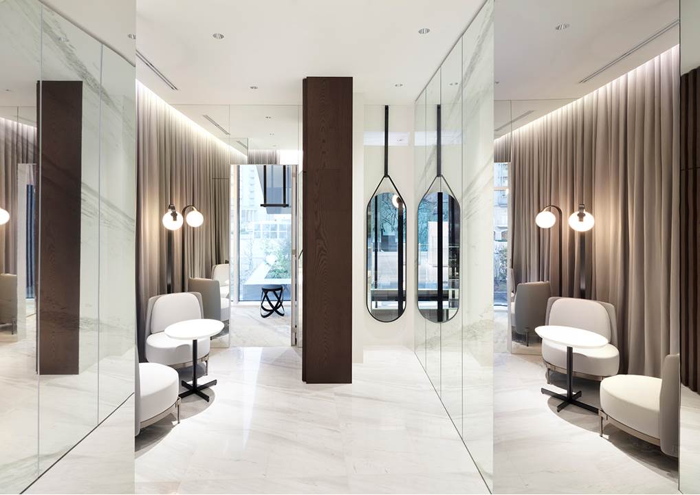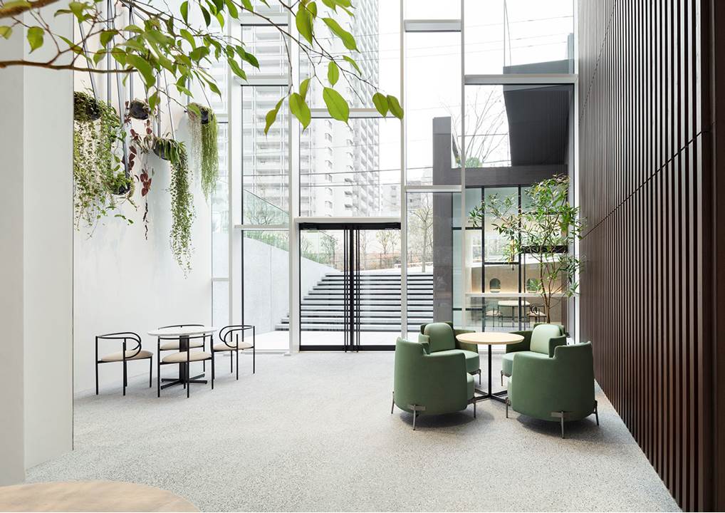 和谐的建筑感还体现在家具元素的选择上,在众多别具一格的作品中,有出自日本设计师之手的Tape扶手椅和围手椅,采用浅绿色和灰色的织物和皮革覆面,摆放在建筑的各个楼层。座椅拥有轻盈的轮廓和紧致的比例,为家居和酒店环境营造出优雅端庄的氛围。值得一提的是,设计师通过众多高级定制细节来向Minotti的剪裁传统致敬,一圈“tape”丝带将支撑脚固定在结构上,赋予作品以迷人魅力。