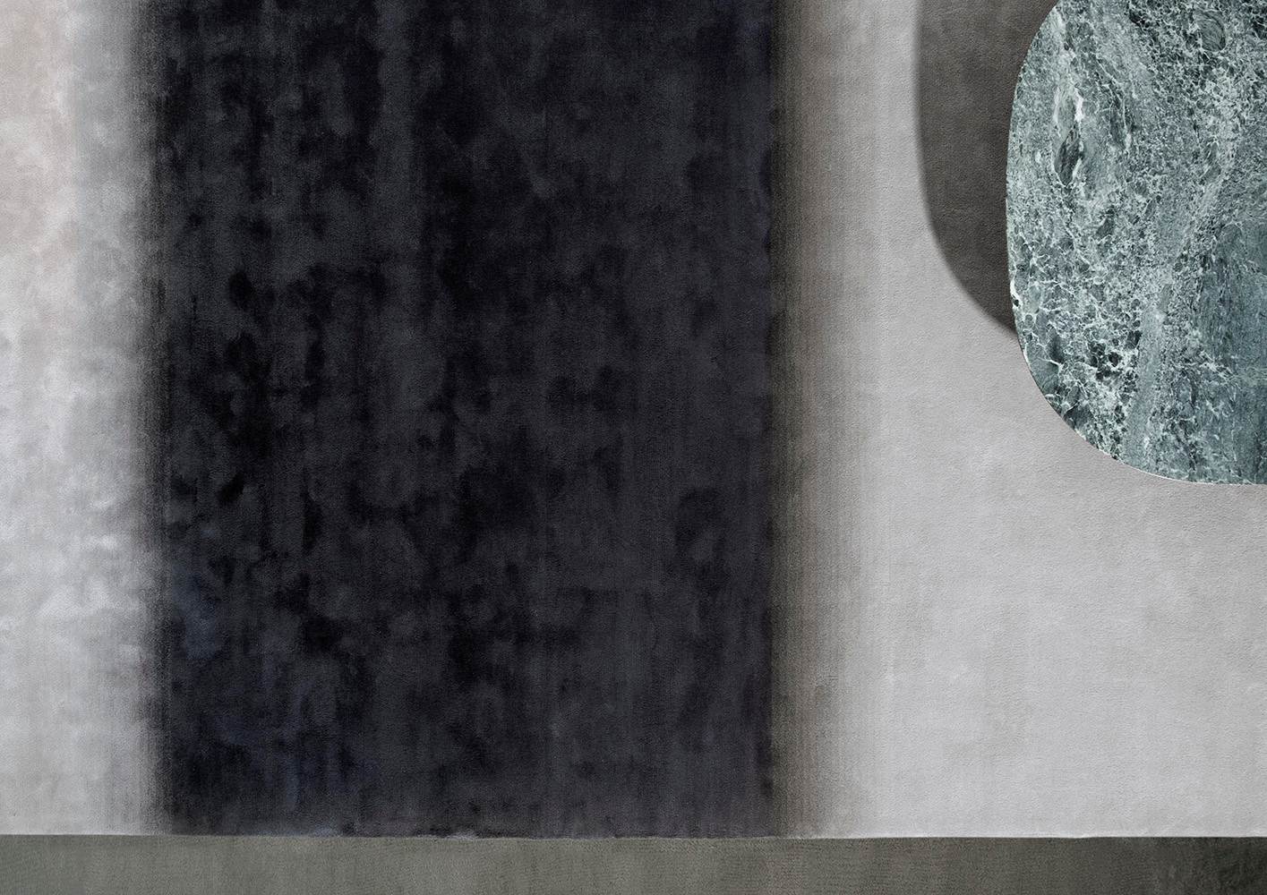 Rug made from 100% Lyocell (a cellulose fibre), hand-crafted according to the manual tufting method. The surface, 16 mm in thickness, made of shorn Lyocell, produces bright, iridescent reflections. The upper layer is made of polyester; whereas the lower layer is treated with natural, prevulcanized, antiallergenic latex. Overall weight 6,5 kg/m². The rug can be made to measure (multiples of 50 cm). Largest size possible: 800x500 cm.