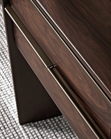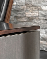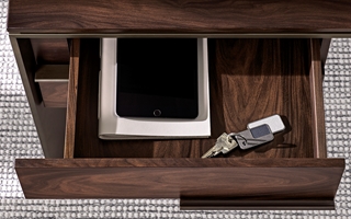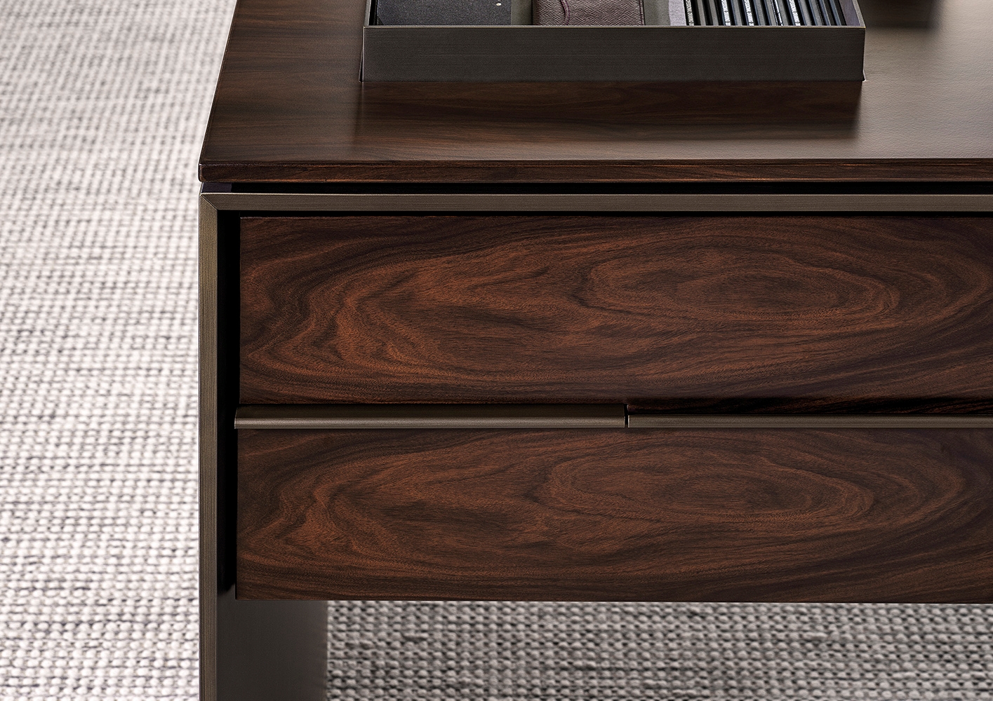 金棕色侧面别具一格,抽屉的底部和前部则采用哑光聚酯漆面深棕色 Santos 酸枝木制成,繁复细腻的纹理为整体构造赋予鲜明个性。桌面设有穿线隔层,内可放置一个金棕色漆面金属储物托盘,其内部隔板和深棕色皮革底面与抽屉形成对应。