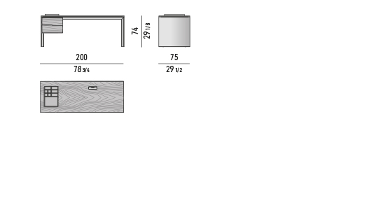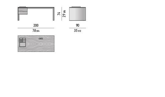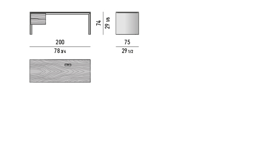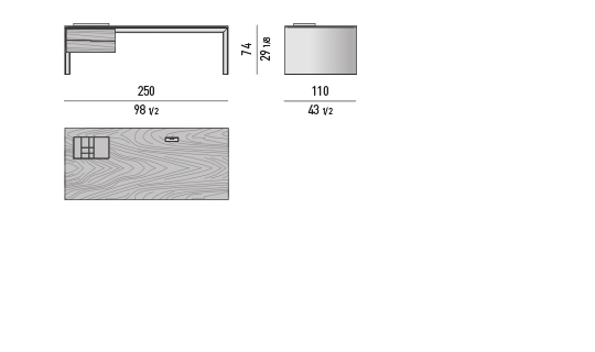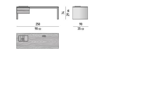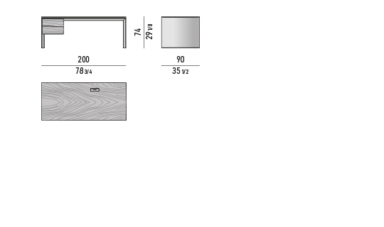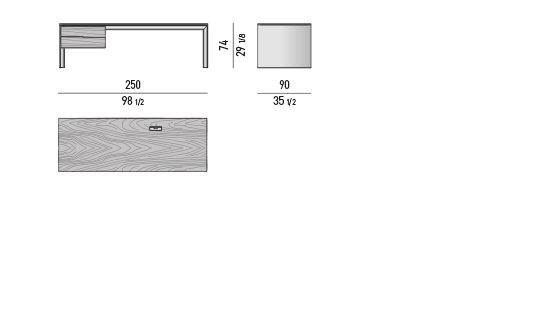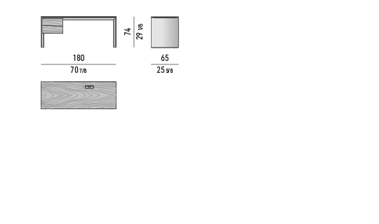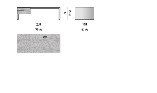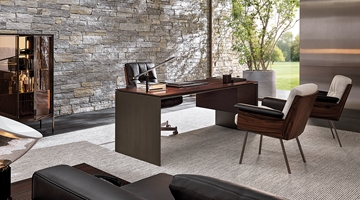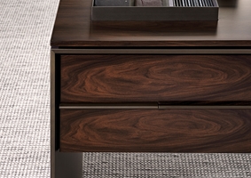 雕塑感构造勾勒出宽大的桥形桌体,桌面与侧面齐平,下方两个抽屉均位于左侧。