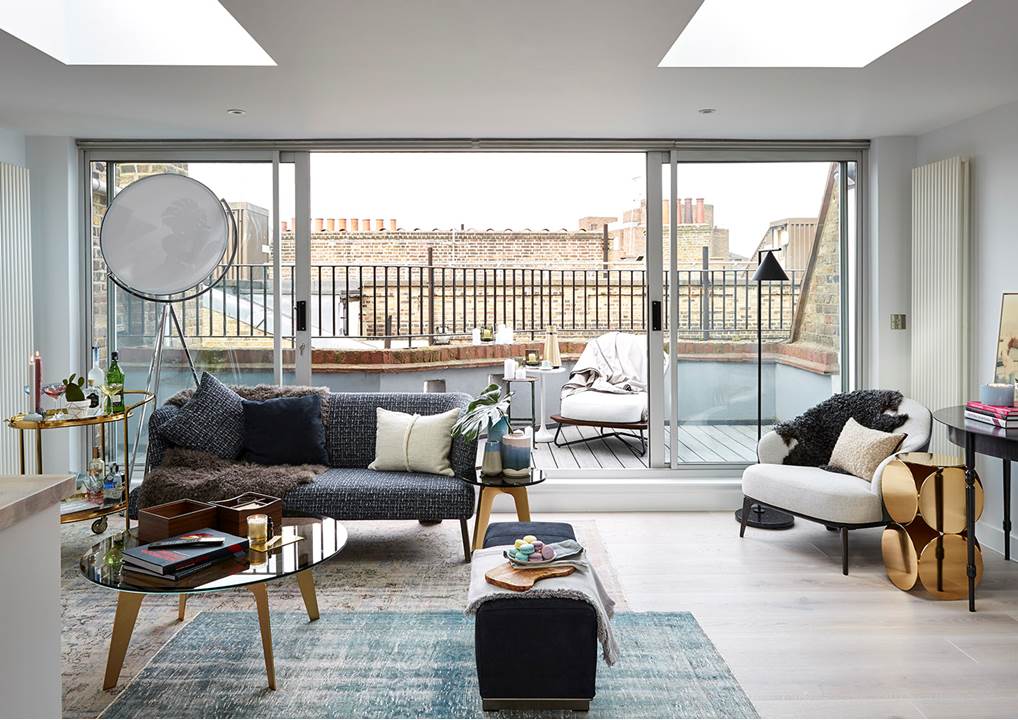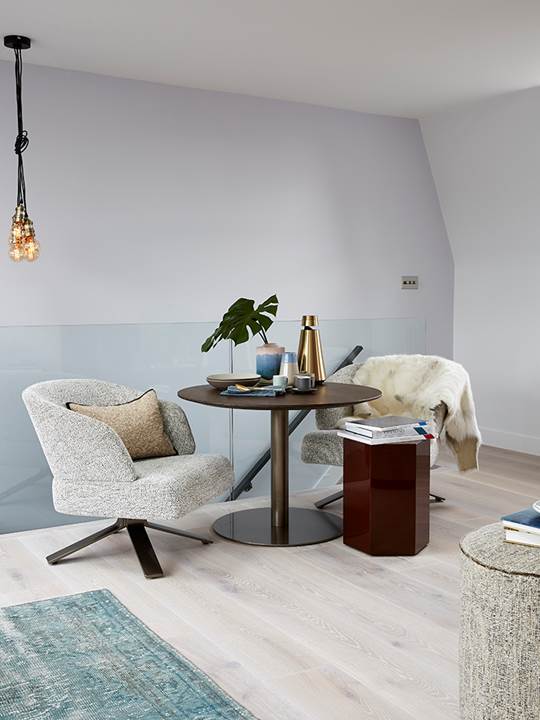 两个大天窗为起居空间提供充足的采光,其中摆放着Leslie扶手椅、Reeves沙发和Freeman休闲凳,这些单品拥有经典的线条和绝佳的舒适性,完美搭配Still和Kirk边桌的精确几何造型和镜面,所有作品都由Rodolfo Dordoni设计。用餐区采用休闲方式加以布置,其中两个舒适的Reeves扶手椅和Corten色的Aeron高脚椅也是出自Rodolfo Dordoni之手,而Bellagio Lounge餐桌则是由Gordon Guillaumier设计。Rodolfo Dordoni设计的Rivera扶手椅造型饱满,拥有优雅的编织靠背和浅灰色户外面料覆面,它无疑是户外空间的真正主角,搭配两个边桌,一个是灰色的Warren边桌,另一个是金属边几。