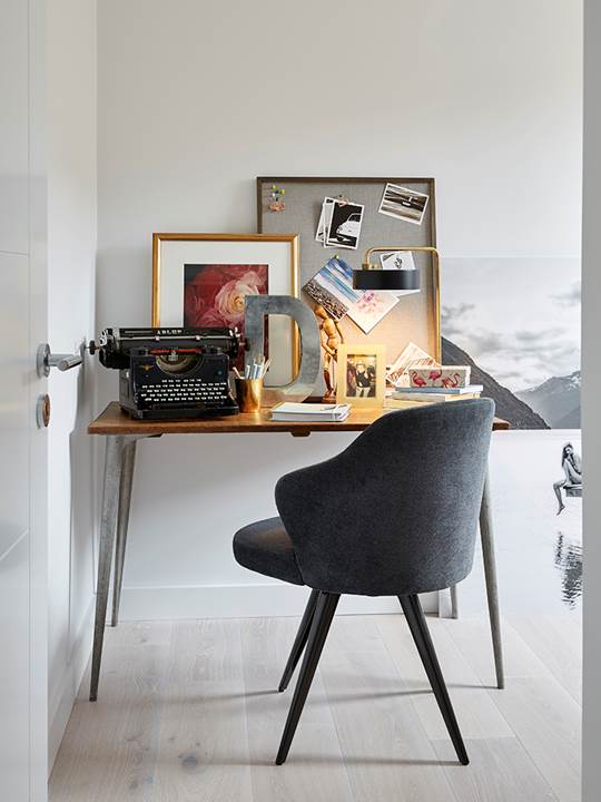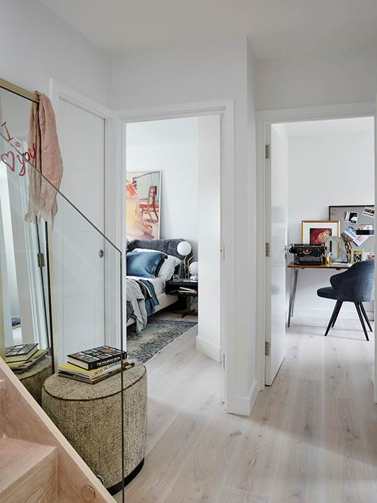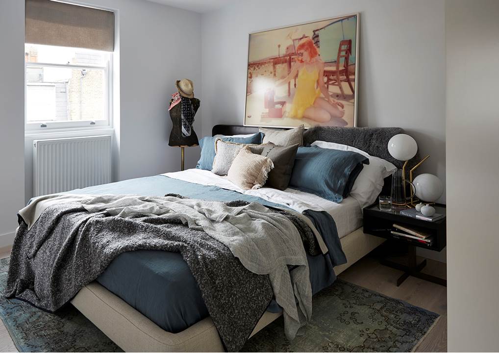 主卧室和书房都采用妙趣横生的艺术作品、照片和现代古董加以装饰,宽大的Tatlin睡床和Leslie的天鹅绒扶手椅都是由Rodolfo Dordoni设计,搭配精挑细选的柔软面料,打造出温馨的氛围,Close床头柜上摆放着一组乳白色的台灯和房主的书籍。