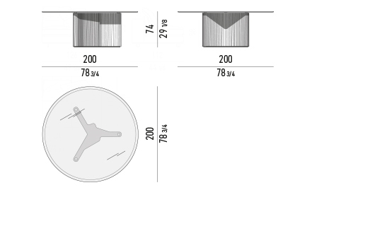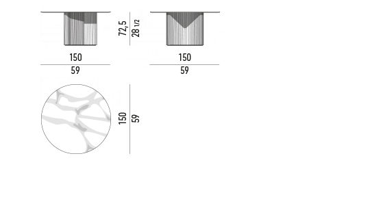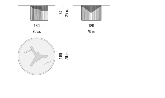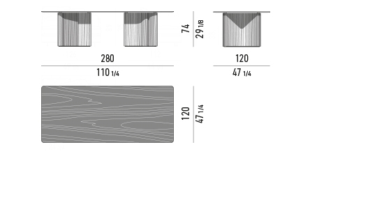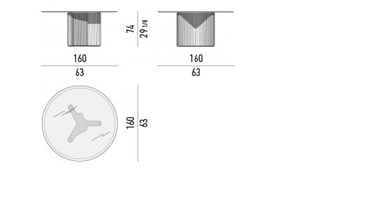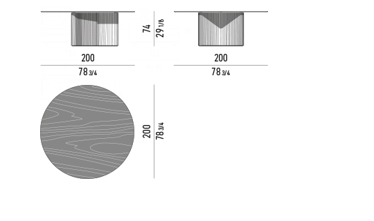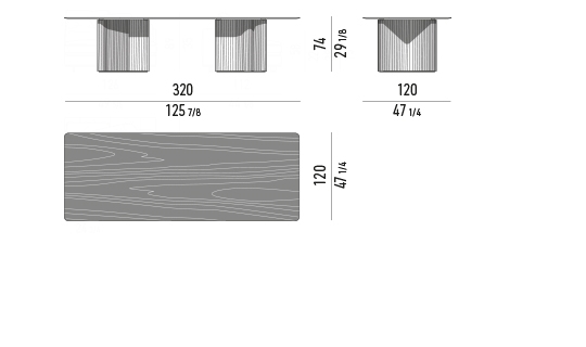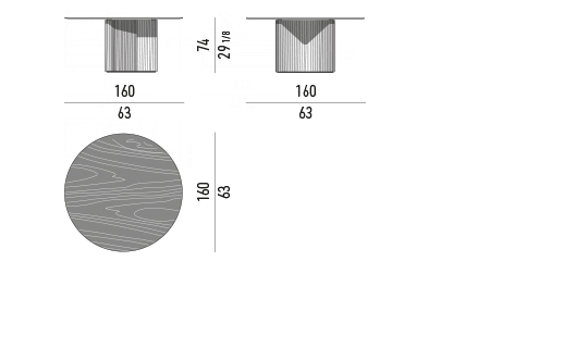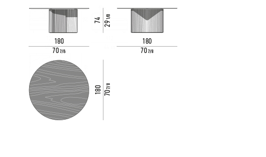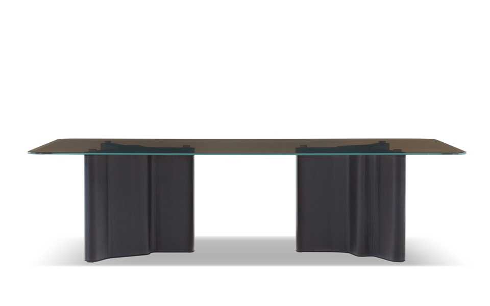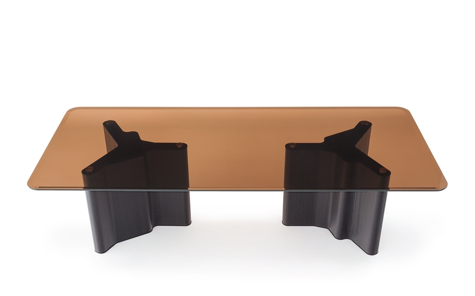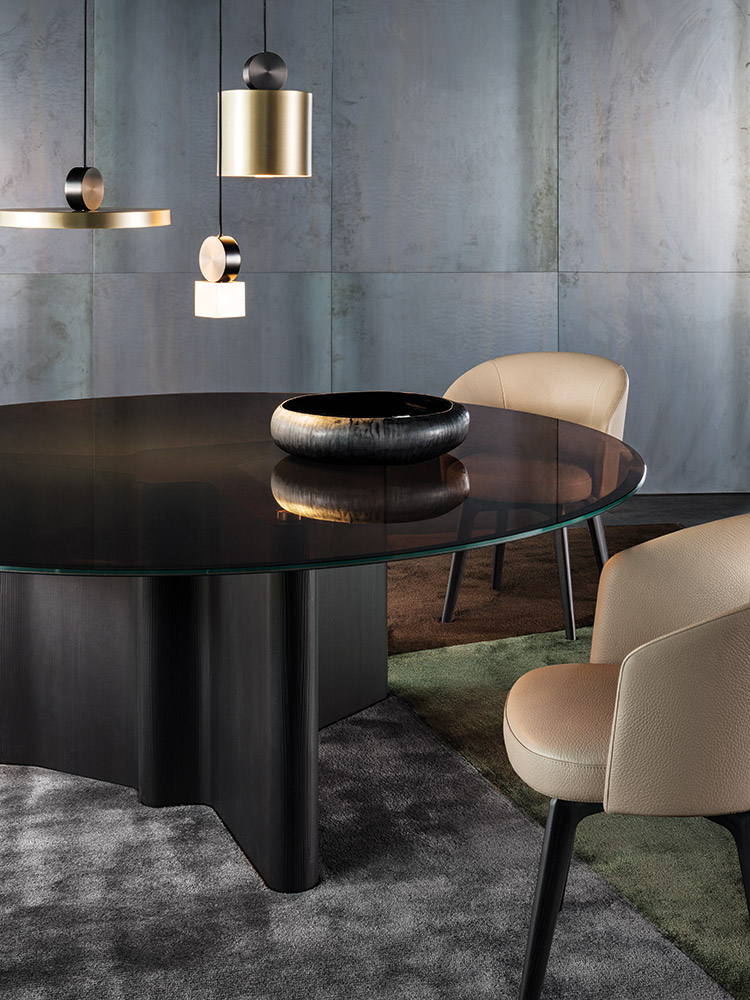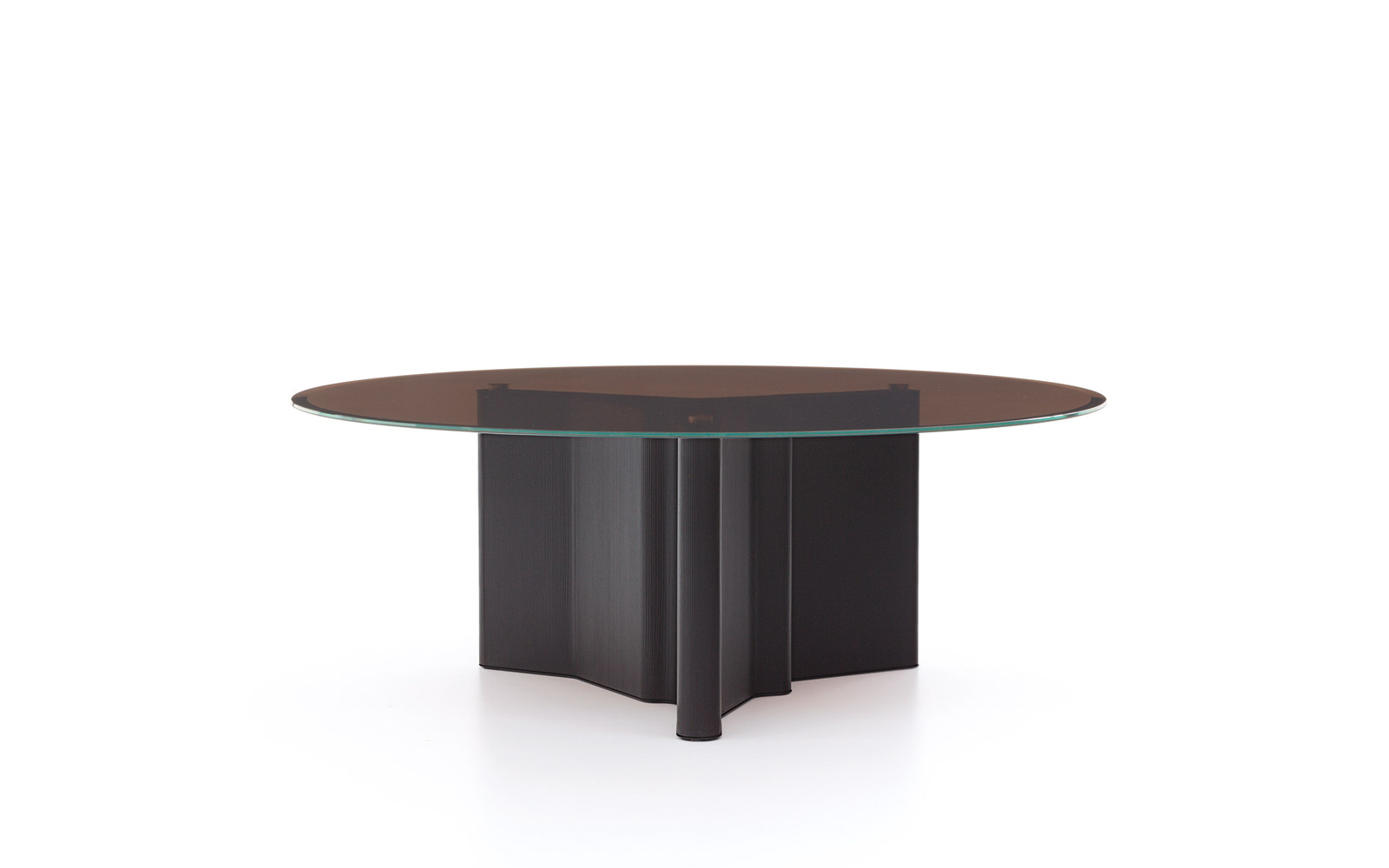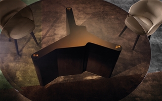精湛的木材加工技术打造出精致复杂的弧线和镶贴木皮饰面。内部成型结构为MDF材质,外部的多层板镶贴落叶松木皮,然后对弧面进行精心打磨。灰褐色漆面的落叶松木基座搭配具有不同饰面效果的台面:灰褐色的火焰纹开孔白蜡木,其下方采用相同色调的亚光漆面;烟灰色的玻璃材质,搭配超透明玻璃和琥珀色的玻璃。直径为150厘米的台面仅可选择Calacatta大理石材质。