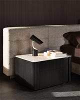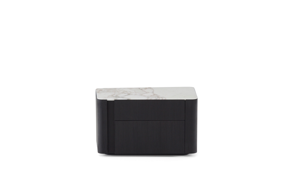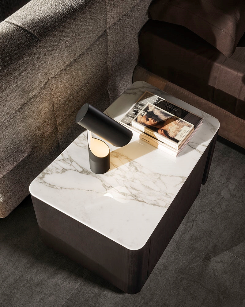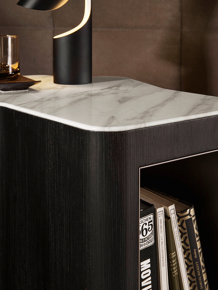 Lou床头柜配有两个实用的侧开式抽屉,框架镶贴落叶松木皮,不仅可以选择灰褐色开孔漆面,还可以选择焦糖色、摩卡色、苔藓色的亮光漆面;嵌入式台面则有Calacatta大理石、Verde Lepanto大理石、Rosso Levanto大理石、黑色玻璃釉可供选择。
