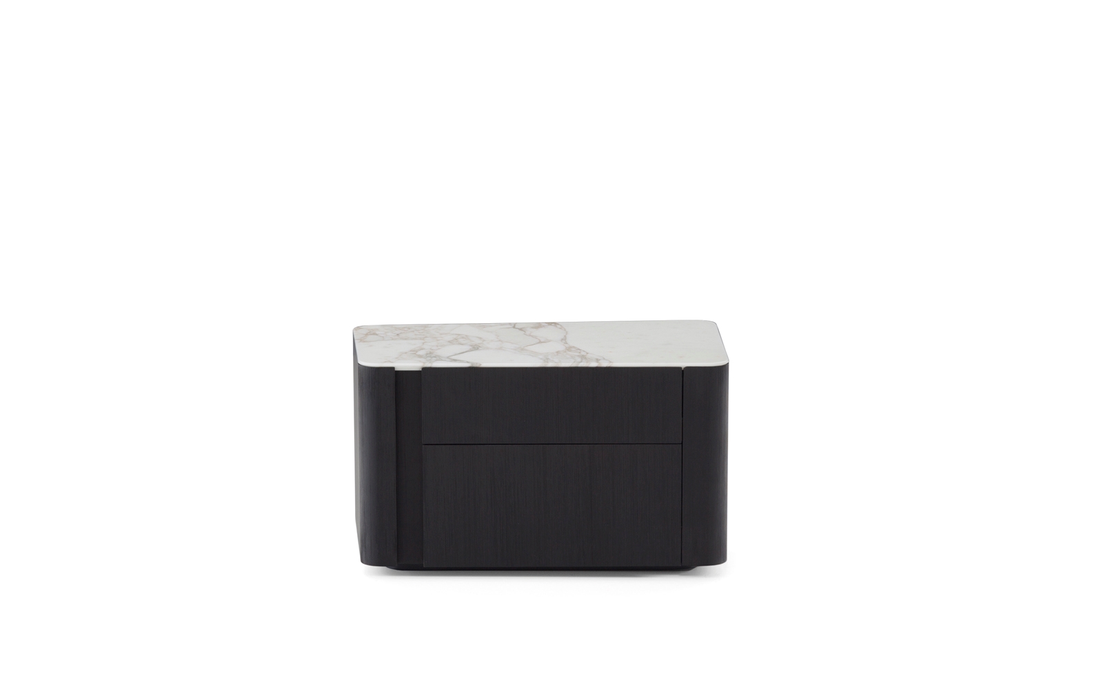 Structure: contoured interior in MDF, sheathed in plywood: - glossy lacquer in Burnt Brown, Moka or Moss colour, sides matt lacquered; - brushed larch veneer, open-pore Licorice colour lacquer finish. The nightstand has two drawers that glide on Blumotion runners, interior finish matches exterior finish. Drawers open from the side. Adjustable feet in Hytrel® (soft scratchproof rubber).