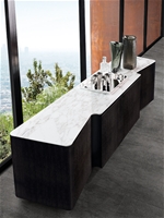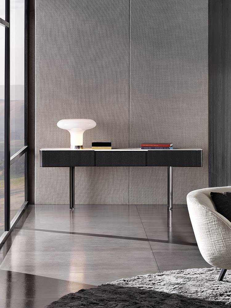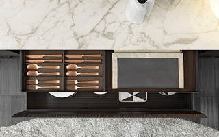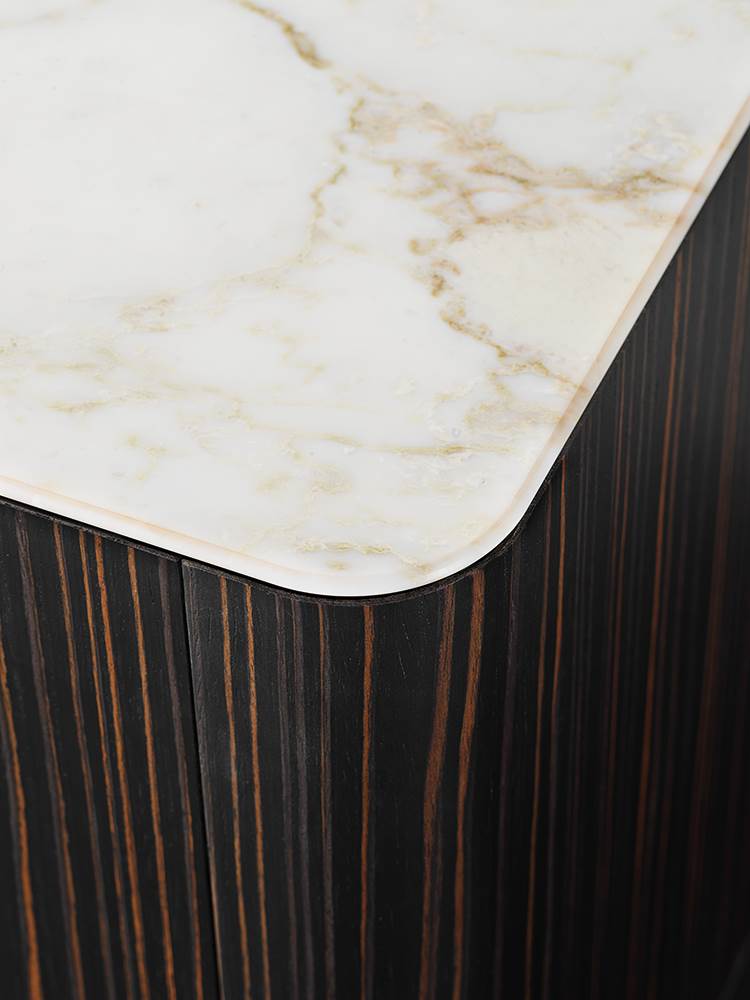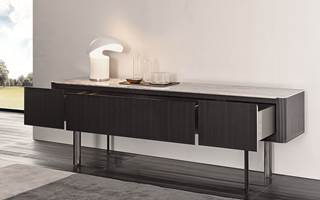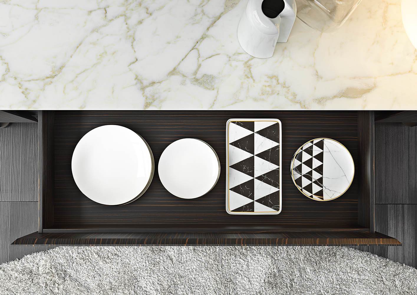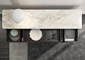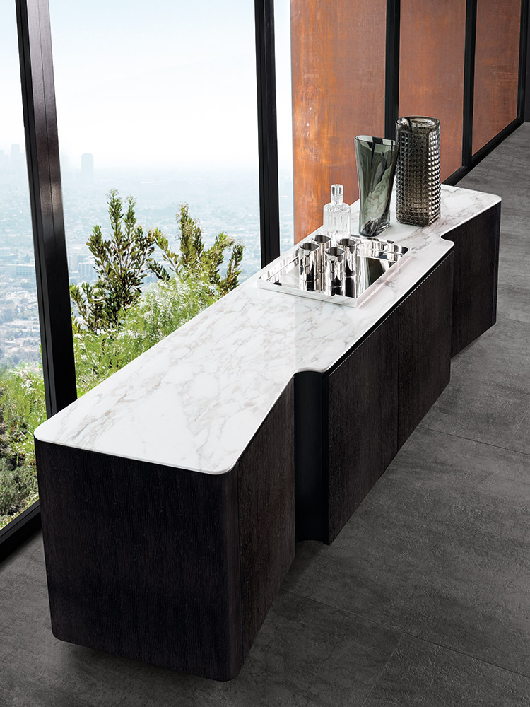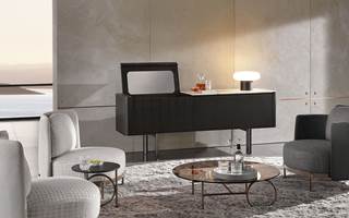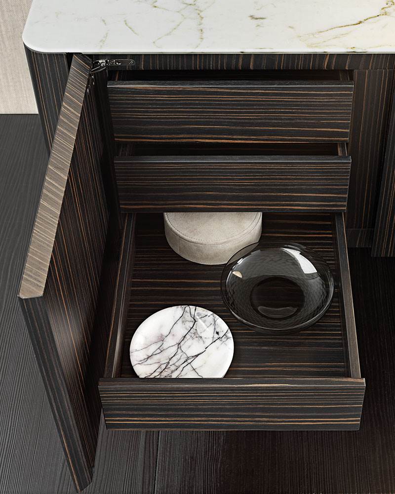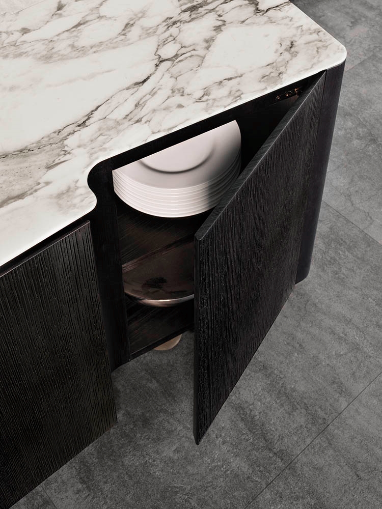 这一系列的产品展现出高端橱柜工艺和技术,其共同之处在于选用的珍贵材质,从结构中使用的拉丝白蜡木、亚光乌木,到Calacatta大理石,从嵌装隔板选用的与结构色调一致的木材,到基座亮光漆面金属,无不精益求精。在保持精致考究细节的同时,此番推出的产品可谓是原有项目的轻量版。