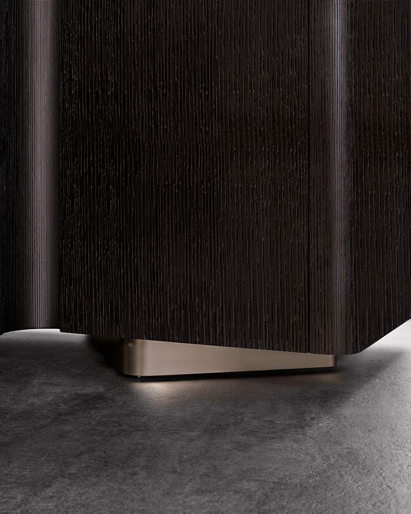 Structure: MDF, ash veneer, open pore lacquered in Licorice colour. Interior finish of the structure and of the interior shelf match the exterior finish, except for the cabinet back panel, which is Sand colour glossy lacquered. Interior shelf is 25 mm thick. Supported on a metal-sheathed wooden base with Bronze colour satin varnish. Adjustable feet in Hytrel® (soft scratchproof rubber).