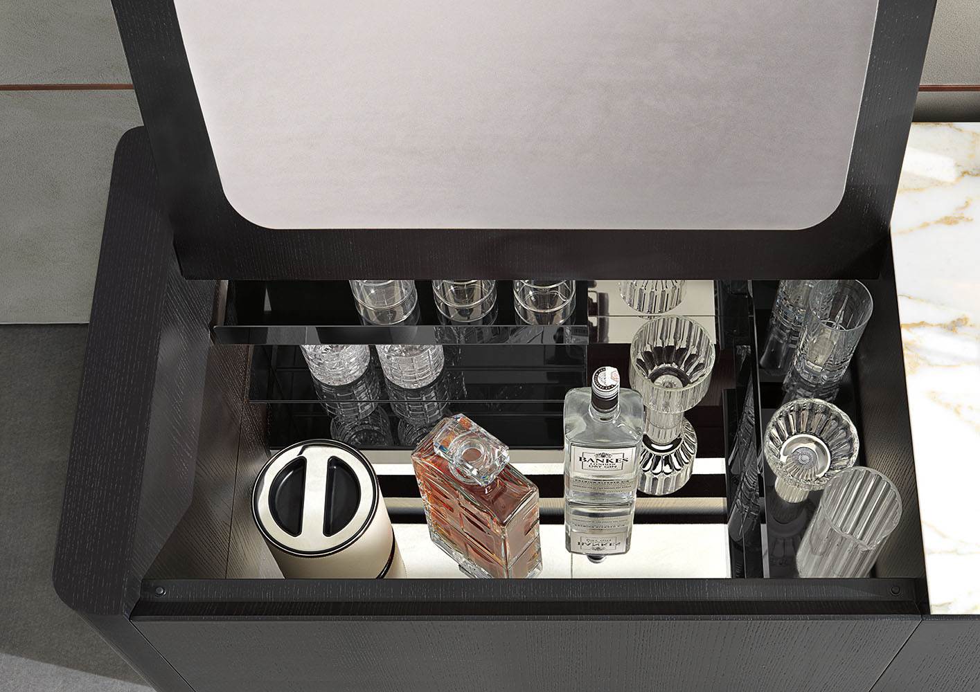 A partially-recessed mirror lines the bottom of the sideboard flip-up top bar compartment. The interior elements of the compartment are finished with steel Mirror and the side panels have the same finish as the structure. Cutlery tray in Tobacco colour saddle-hide located in the left compartment of the internal drawer. Drawer bottom is lined in Tobacco colour saddle-hide. Inside the lift-top compartment there are 2 metal glass holders varnished polished Pewter colour.