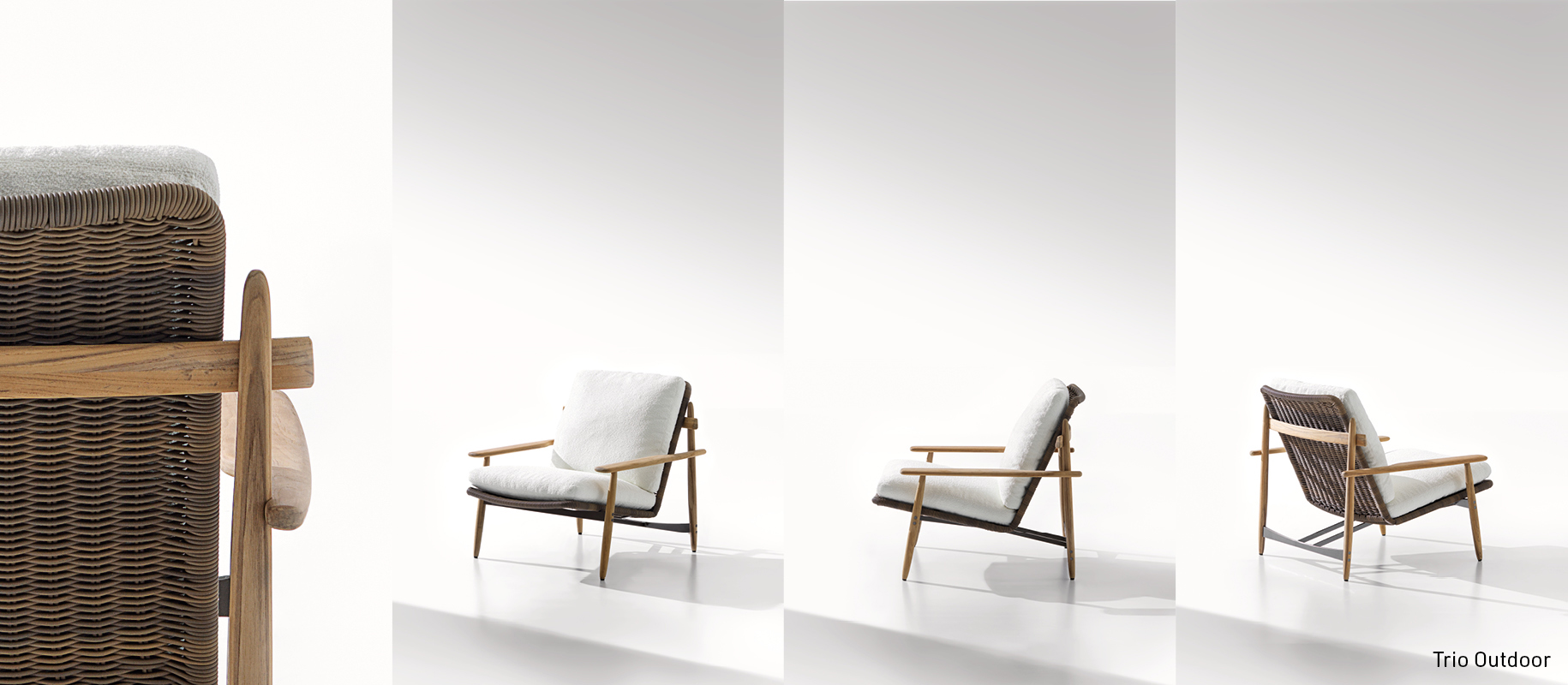 <p>Marcio Kogan为2024系列设计的<strong>Trio</strong>扶手椅将多种材料巧妙组合在一起,还推出了适用于户外环境的<strong>Trio Outdoor</strong>版本。</p>