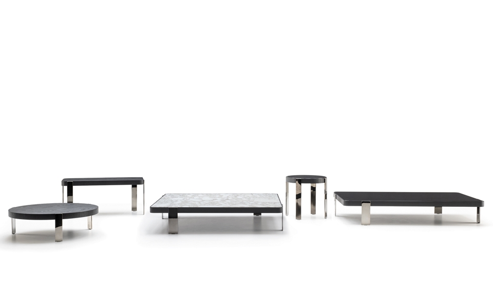 边几家族拥有圆形、长方形和正方形的几何形状,提供不同的尺寸和高度,有三个版本可供选择:Calacatta大理石或黑色玻璃釉台面搭配灰褐色拉丝白蜡木框架,或者整体完全为灰褐色拉丝白蜡木材质。边几采用黑镍饰面的金属支撑腿。