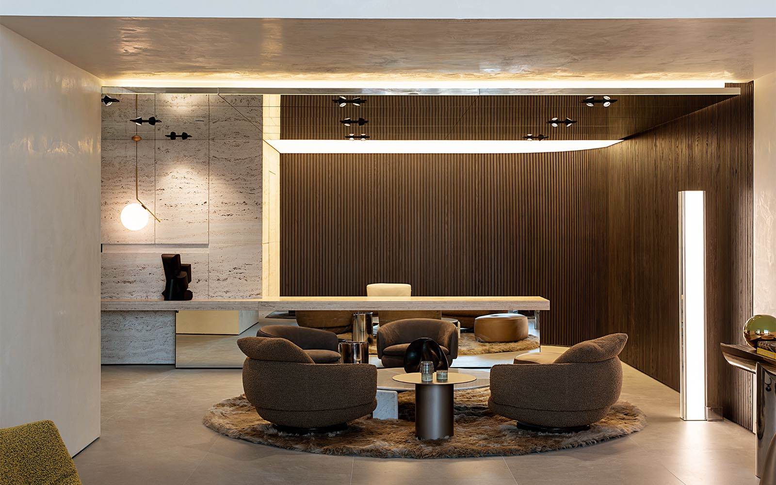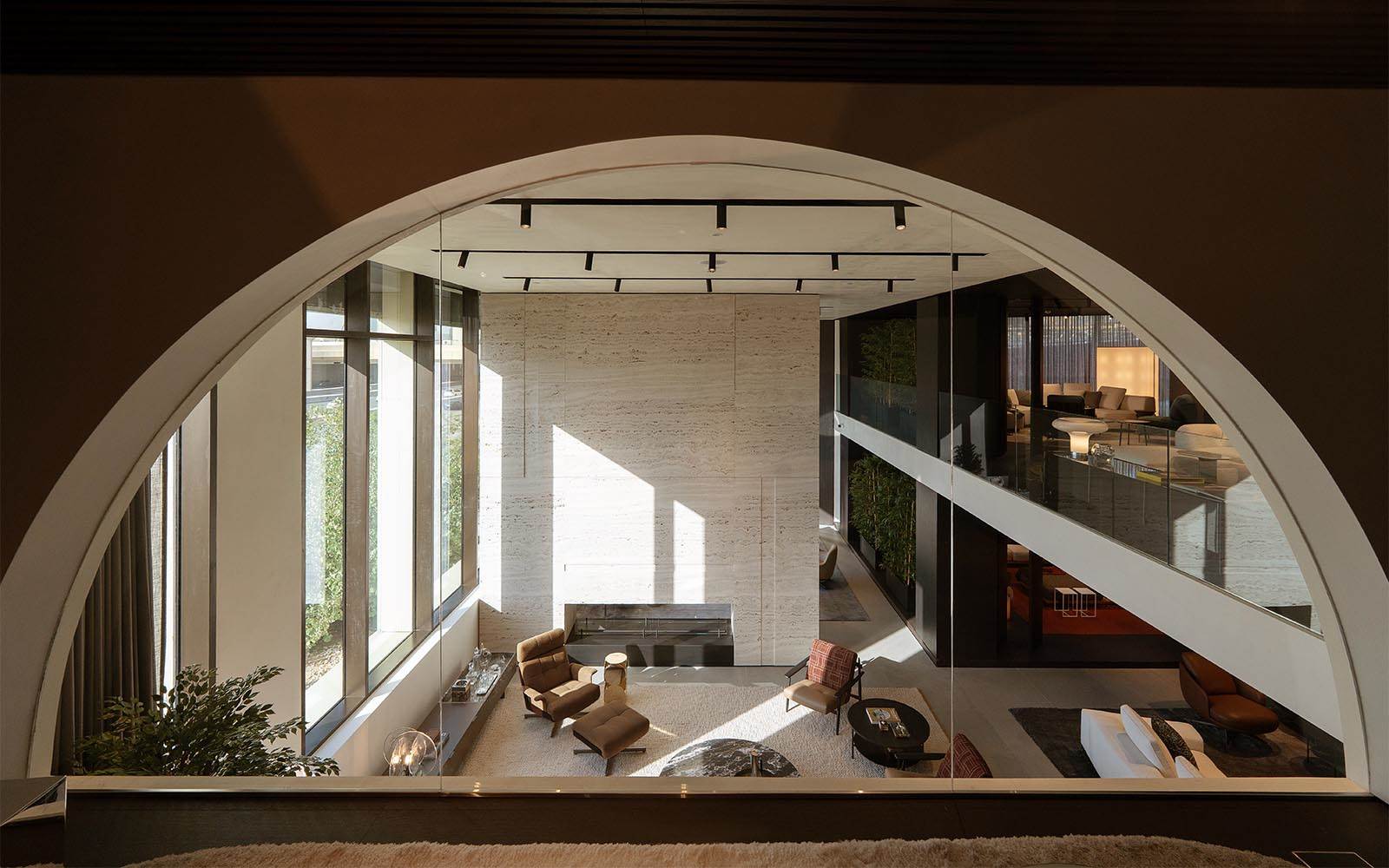 展厅由Minotti Studio策划,坐落在一幢解构主义风格的建筑内,展厅面积大约为620平方米,透过三面落地窗,沉浸式设计动线清晰呈现在眼前。