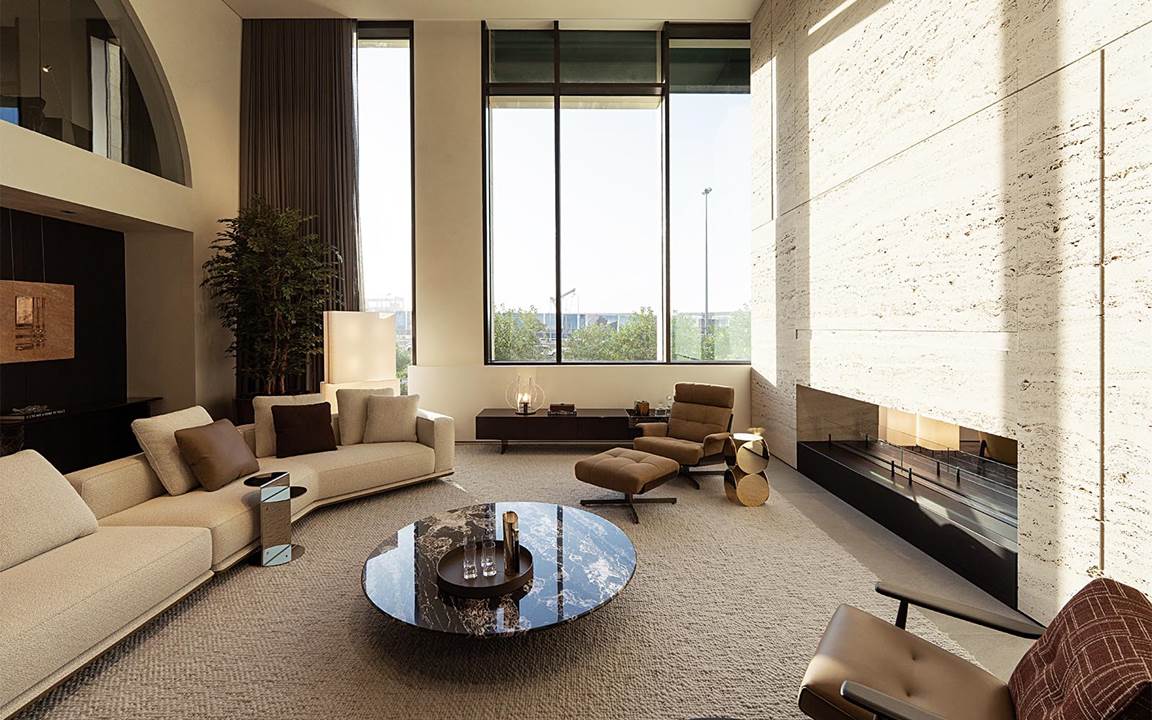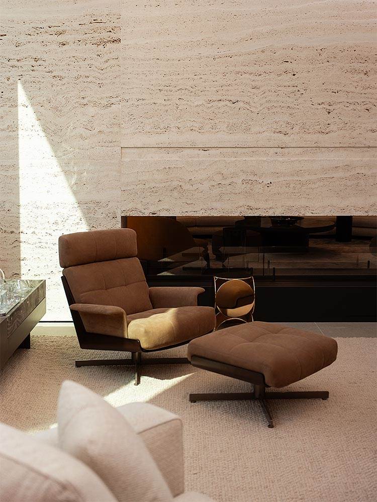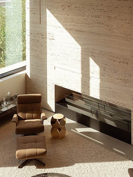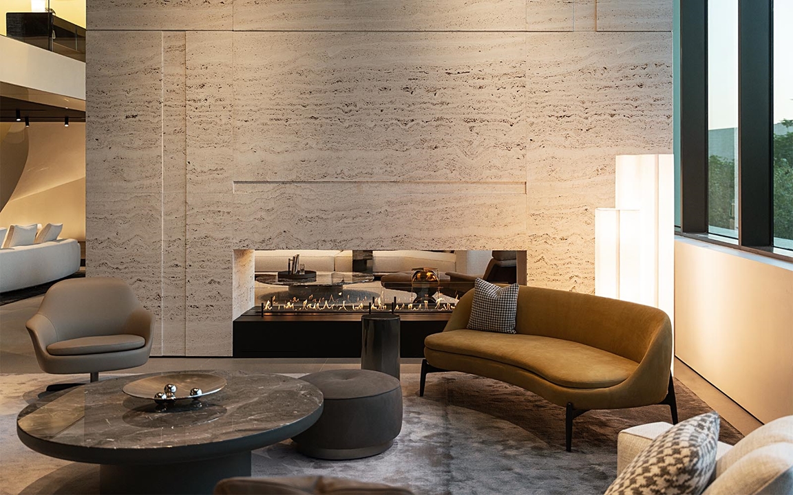 入口与接待区通往第一个挑高的客厅空间,这里摆放着Hannes Peer设计的Yves沙发座椅系列。空间的动线在Marcio Kogan / Studio MK27设计的Horizonte与Bézier系列之间延展开来,中间以一座洞石材质的壁炉作为分隔,壁炉呈现出非凡的雕塑感,因此成为空间的视觉焦点。