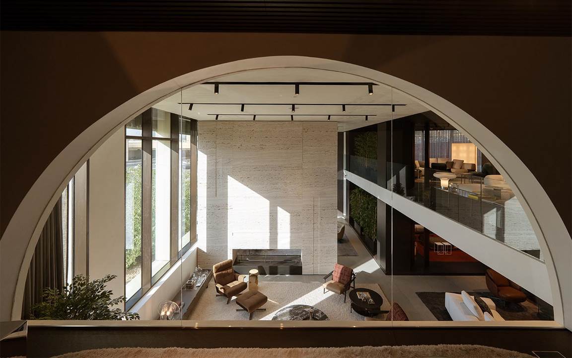 室内设计理念以拱形结构为灵感,采用现代方式重新加以诠释,将白色洞石、石膏、棕褐色橡木和石灰石等材料结合在一起。与此同时,底层与楼中层开辟出两个户外空间,将户外场景引入展厅中央,在室内与户外之间形成自然的互动,将古罗马宅邸与阿拉伯住宅的传统设计融入其中。