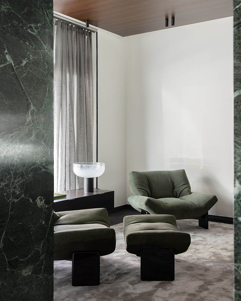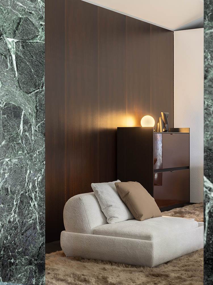 室内设计将经典元素与现代美学巧妙融合在一起,不仅契合建筑本身的历史底蕴,同时展现出Minotti的现代优雅格调。整体空间基于中性色调,选用高级材质加以装饰,诸如Mongoy胡桃木、拉丝不锈钢、Verde Lepanto大理石、Burnt Brown颜色的亮光漆面,同时搭配镜面墙壁和白色石膏墙,与建筑细节相得益彰,为品牌系列构筑一个精致的展示背景。