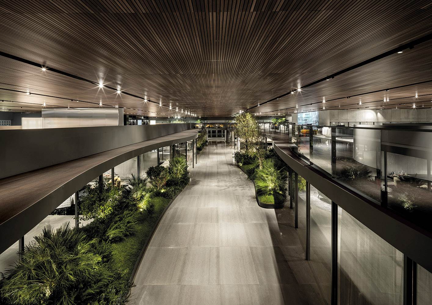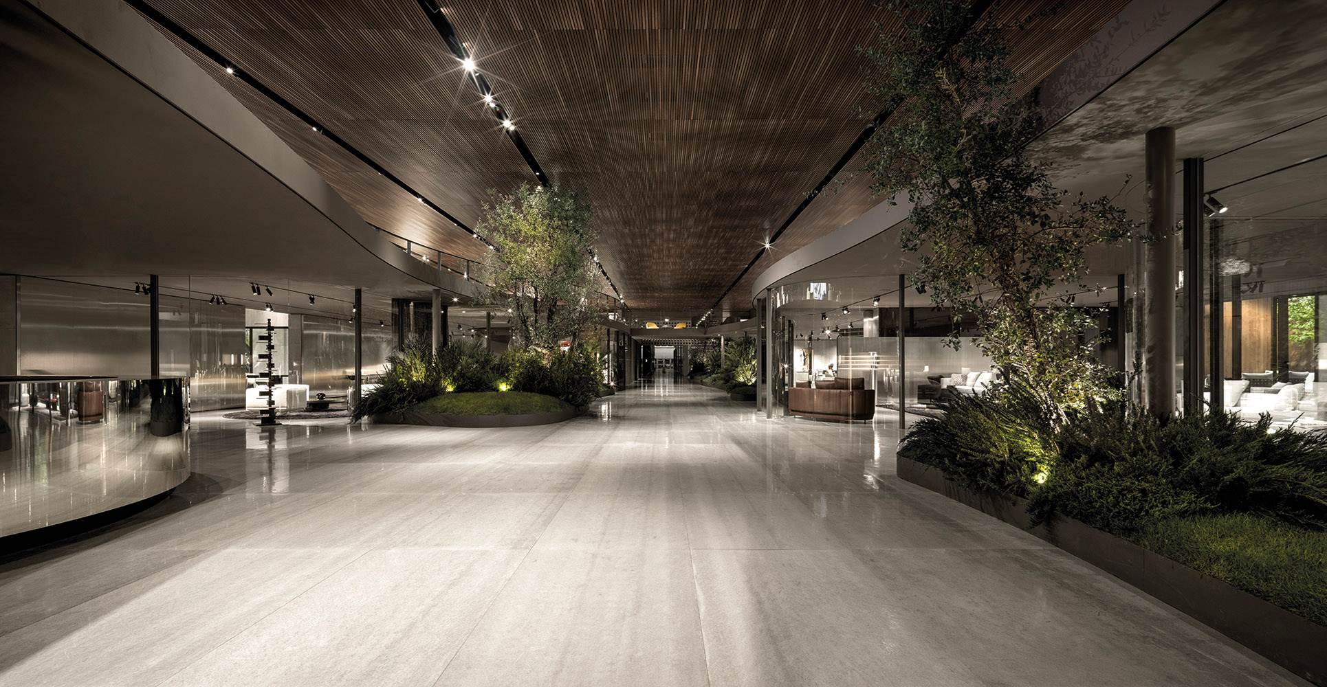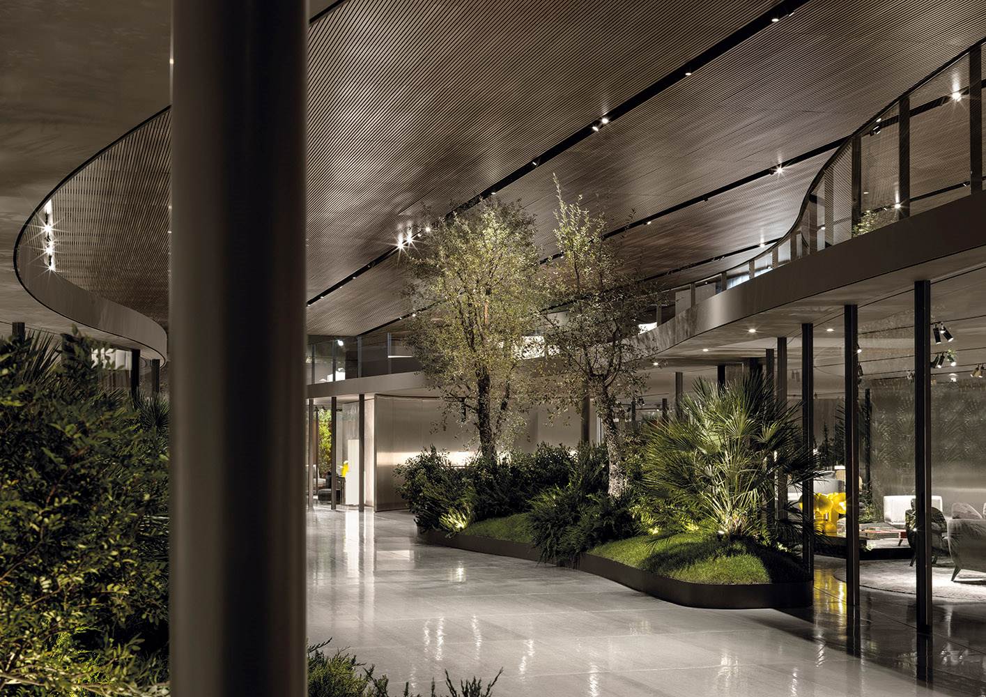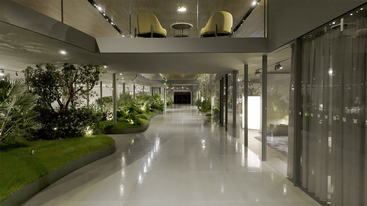中央过道仿若一条真正的林荫大道,丰富的绿植使其充满生机,让人联想到地中海的灌木丛;这条通道不仅运用一种崭新的方式来演绎展览区域,还让参观者沉浸在一个超越边界的空间之中。