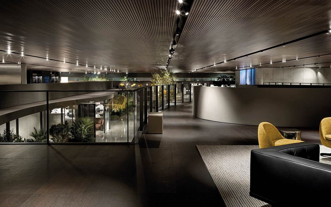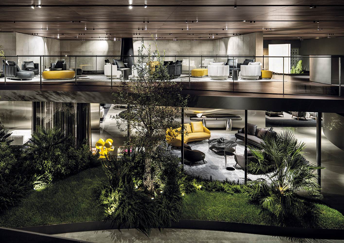 一层的有机形式也延续至二层的空间,通过两个螺旋楼梯来到二层,在这里可以欣赏到绿意盎然的景致,感受Minotti世界的广阔天地;展览空间的每一处角落都开启一个场景,以此来讲述公司不断持续的发展之路。