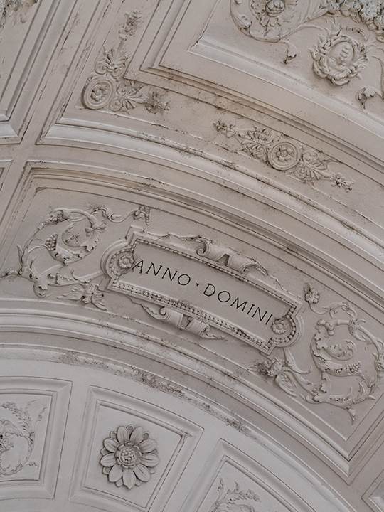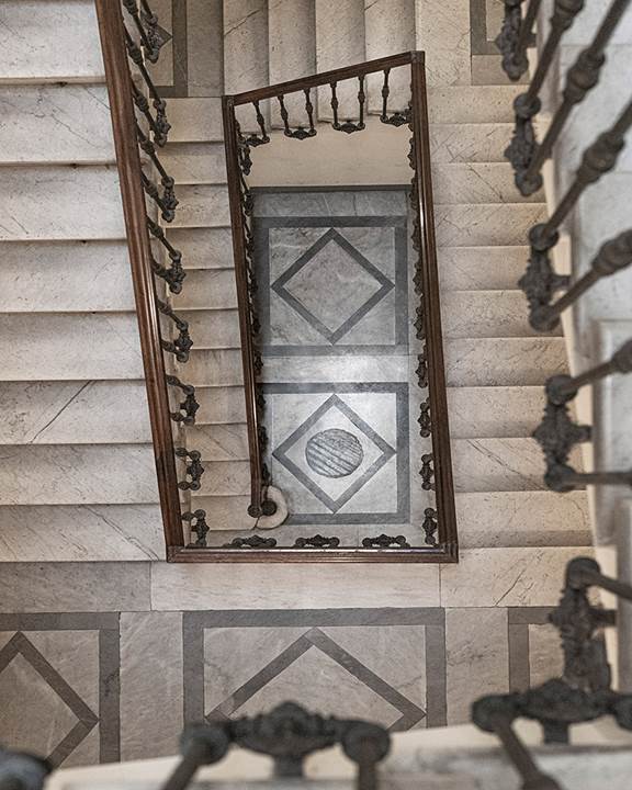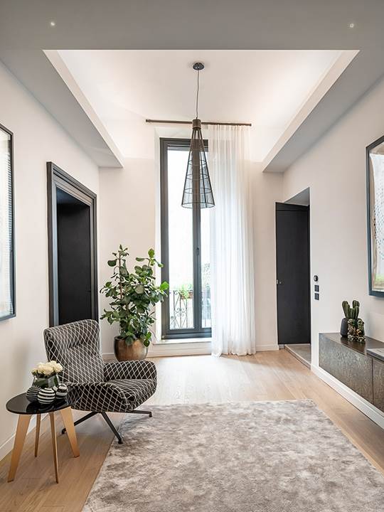入口处连接着镶嵌大理石地板的楼梯,目光上移,即可看到粉饰灰泥边框的天花板。宽敞明亮的走廊摆放着传统图案织物覆面的Jensen扶手椅和Kirk Cross咖啡桌,两款家具皆由Rodolfo Dordoni设计。