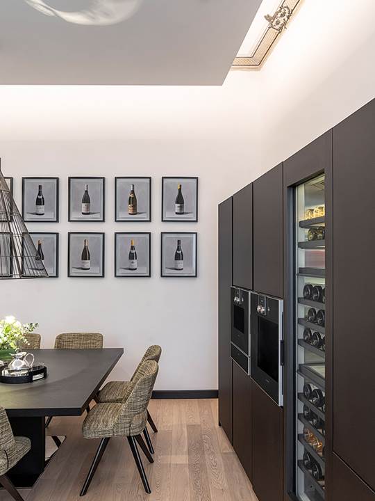 生活区与厨房相连,这里原本是宫殿的私人小教堂,白色的墙壁与壁画相得益彰,这里分为料理区和聚餐区,中央摆放着引人注目Toulouse餐桌,搭配Owens软垫餐椅,两者都是Rodolfo Dordoni的设计作品。