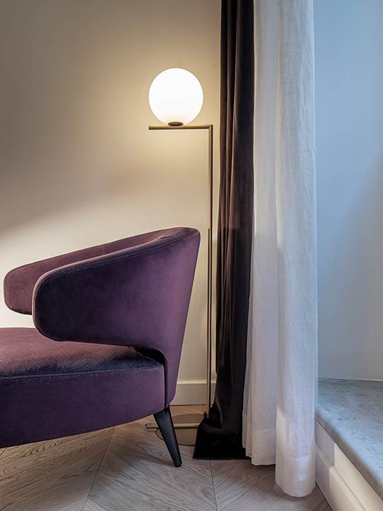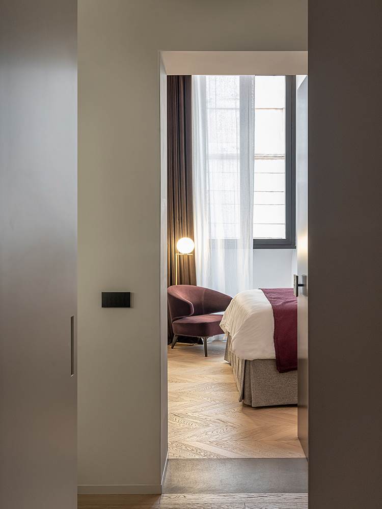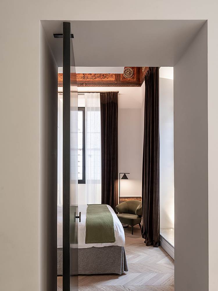 最后,睡眠区由三间套房组成,配备所有舒适的设施,每间套房都有一个私人浴室,设计方案所面临的挑战是不能遮盖6米高的辉煌的方格天花板。因此,每间浴室都选用较低的家具造型,仿佛是房间中的魔法盒子。睡床和衣柜旁边是舒适的休闲区,选用Rodolfo Dordoni设计的Aston扶手椅,每套家具方案都有不同的颜色,与套房所选用的三种色调保持一致。